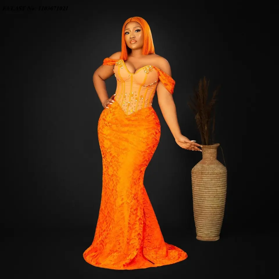 2025 vestidos de graduación naranja brillante africano personalizados largo sirena con cuentas encaje negro mujeres fiesta Formal Aso Ebi vestidos de fiesta de noche