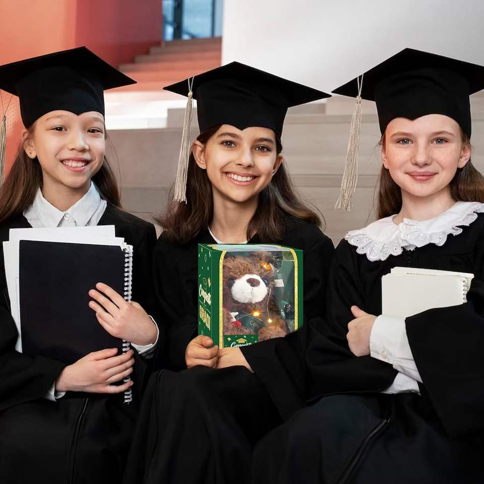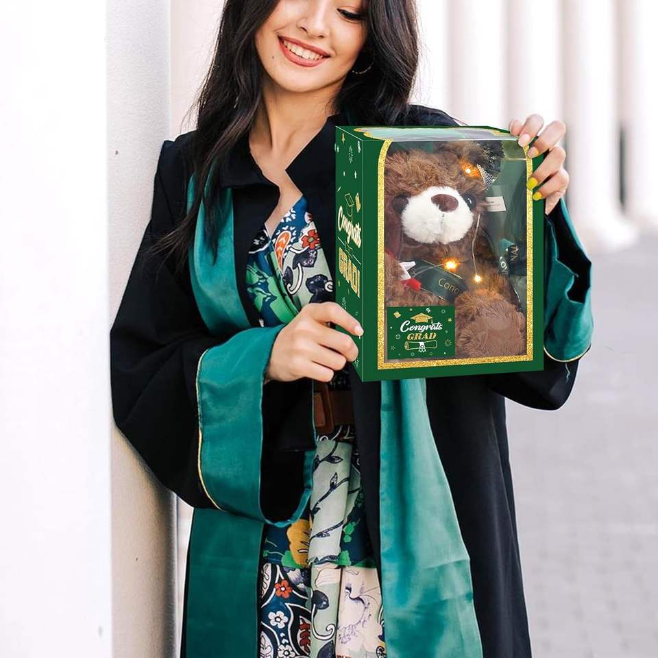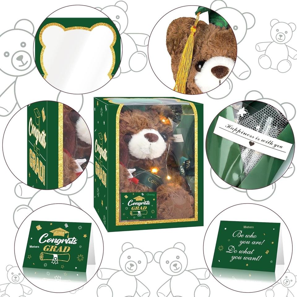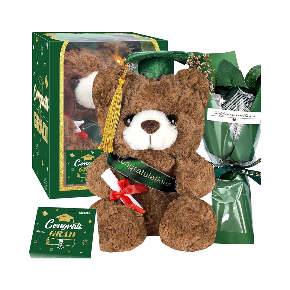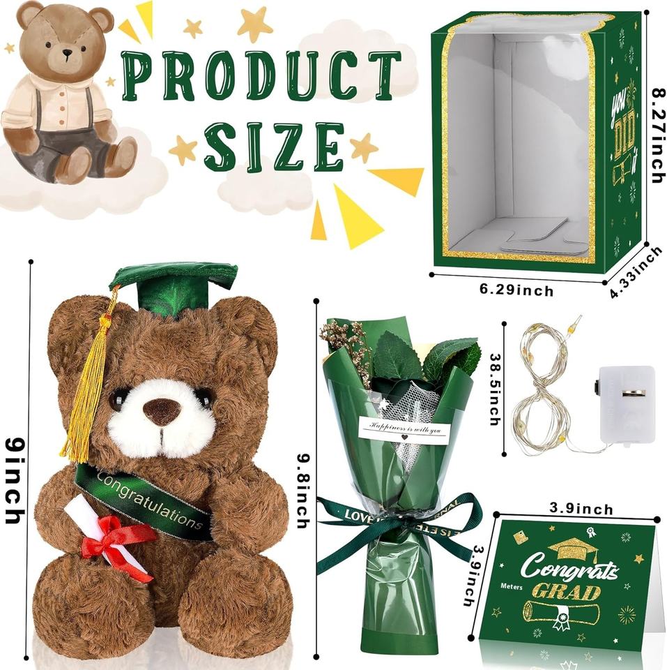 Set de Regalos de Graduación 2025: Oso de Peluche, Flor Artificial, Tarjeta de Felicitación, Decoraciones Verdes para Fiesta de Graduación