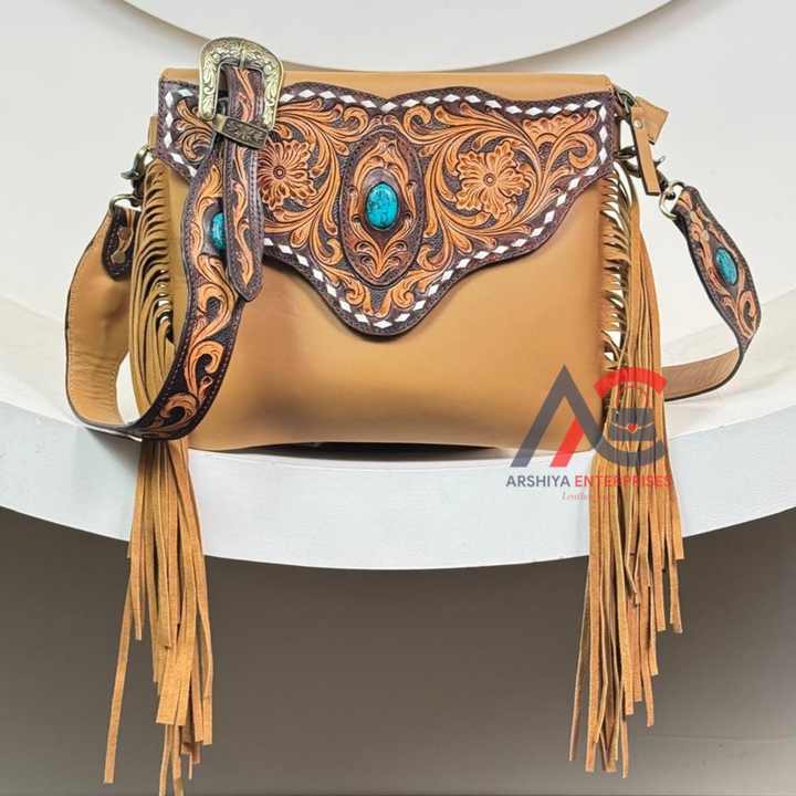 Mano Tooled Fringe cuero genuino Crossbody Messenger Bag