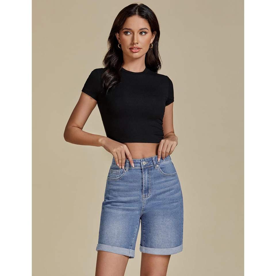 2025 pantalones cortos vaqueros de cintura alta para mujer, de moda, informales, de verano, con dobladillo plegable, Vaqueros largos elásticos, de 7 pulgadas, con entrepierna, cintura media, ajustados