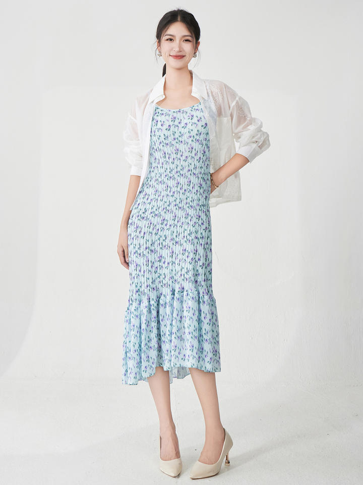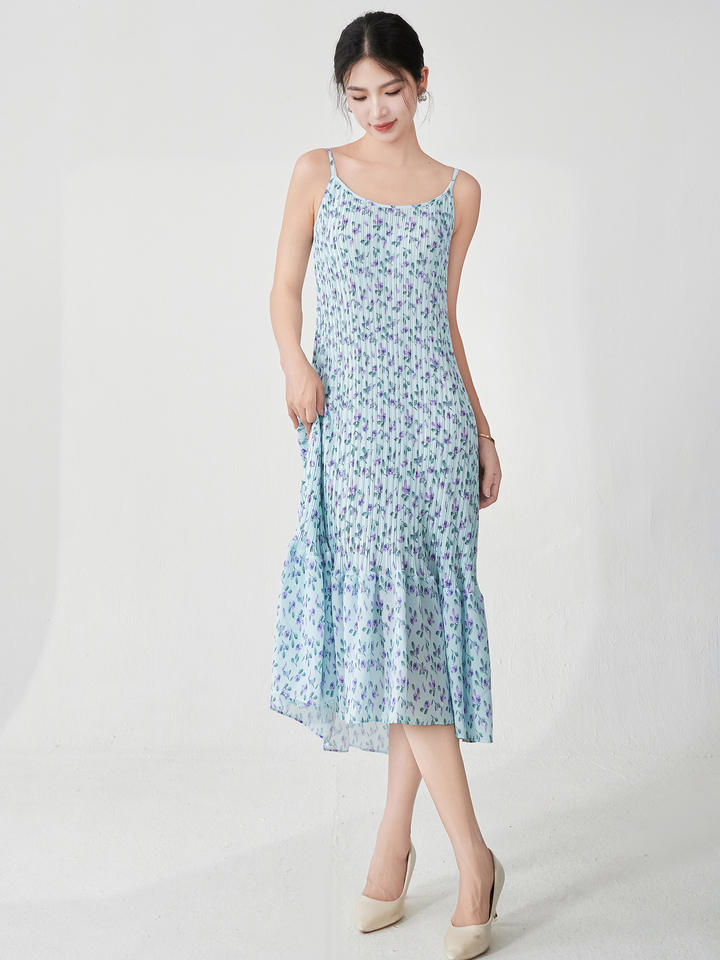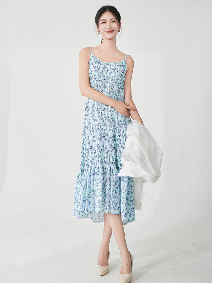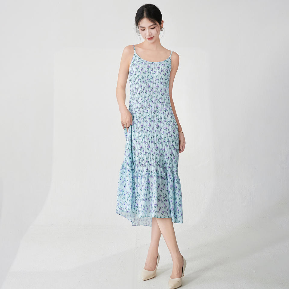 2025 estilo coreano de moda elegante para mujer azul claro floral vestido plisado de longitud media