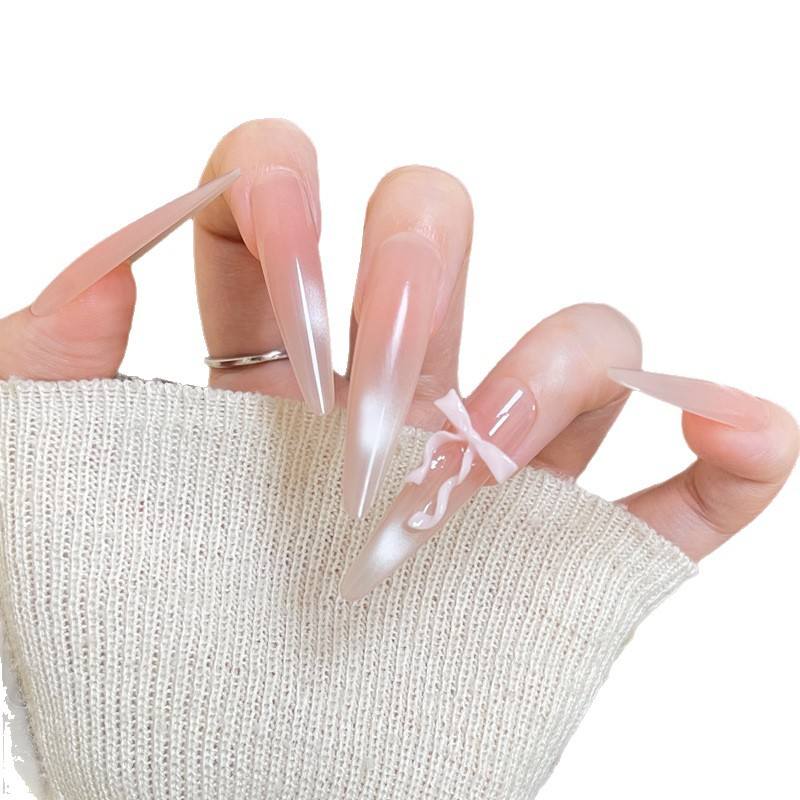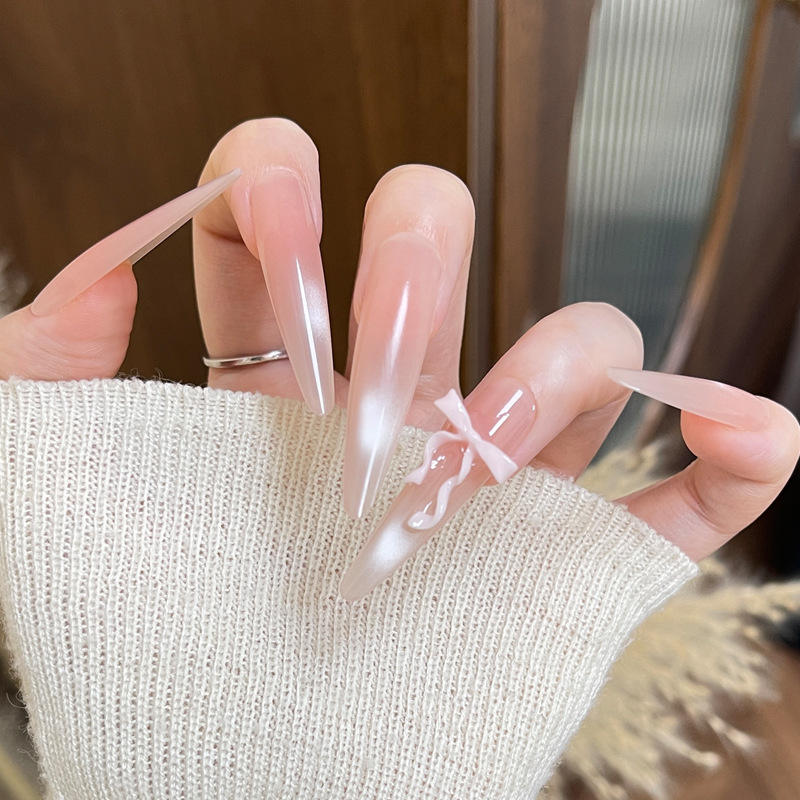 Últimos Modelos 2025, Uñas Postizas Hechas a Mano, 4.0, Delgadas, Rosa Nude Degradado, Lazo 3D, Lujo, 30 Piezas, Uñas a Presión