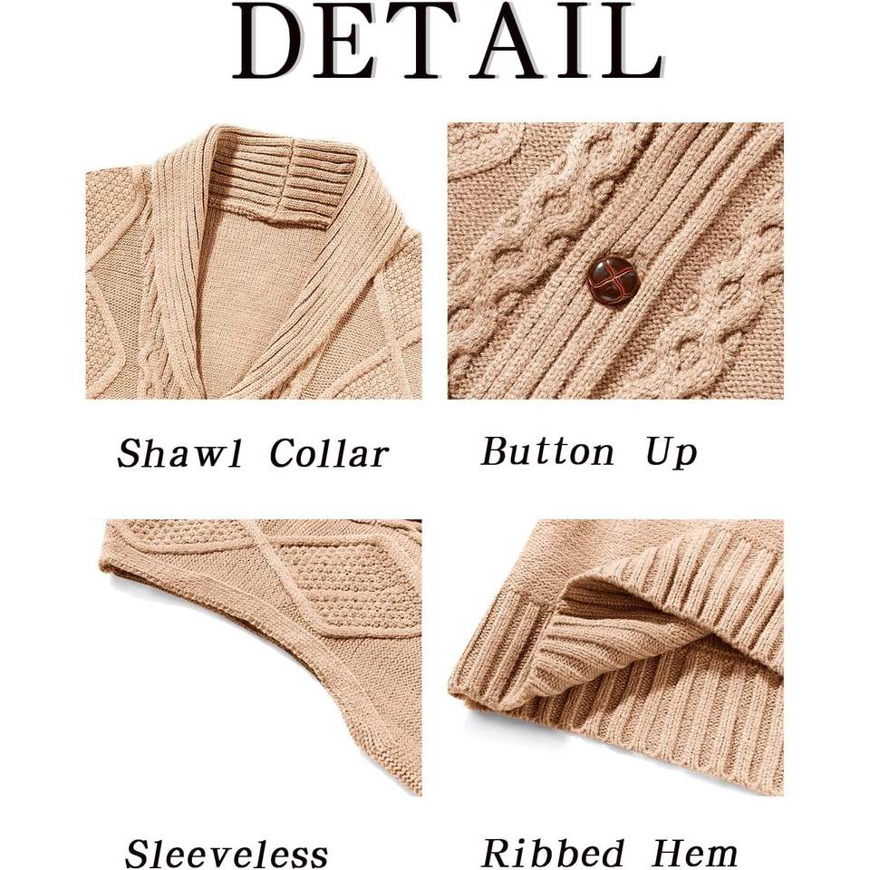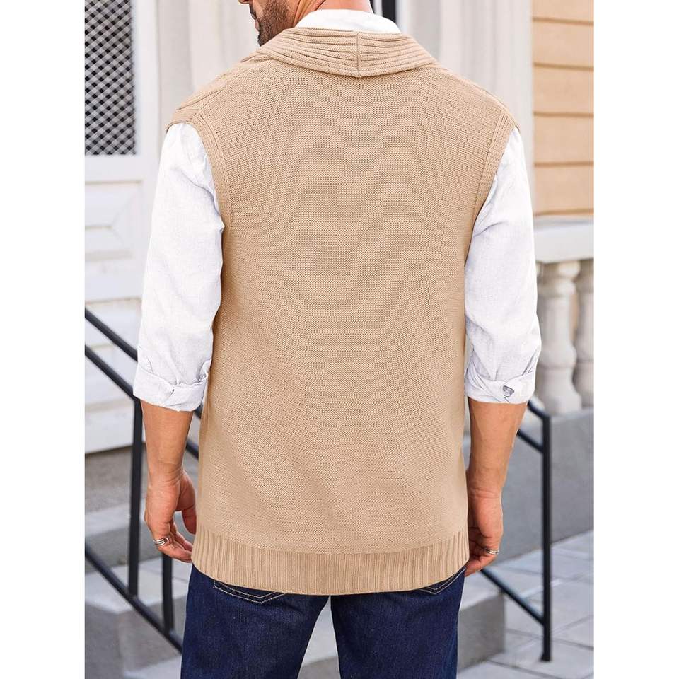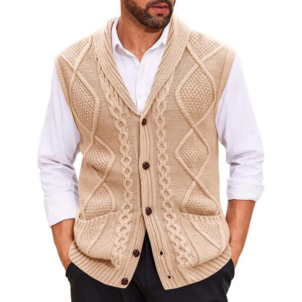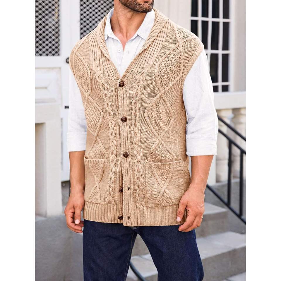 Cárdigan de punto con cable para hombre 2025, Chaleco Ajustado informal de invierno con cuello chal, suéter sin mangas con botones y bolsillos