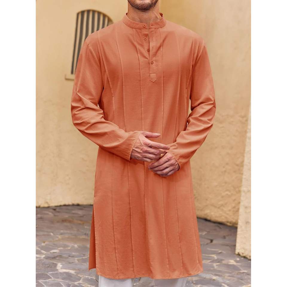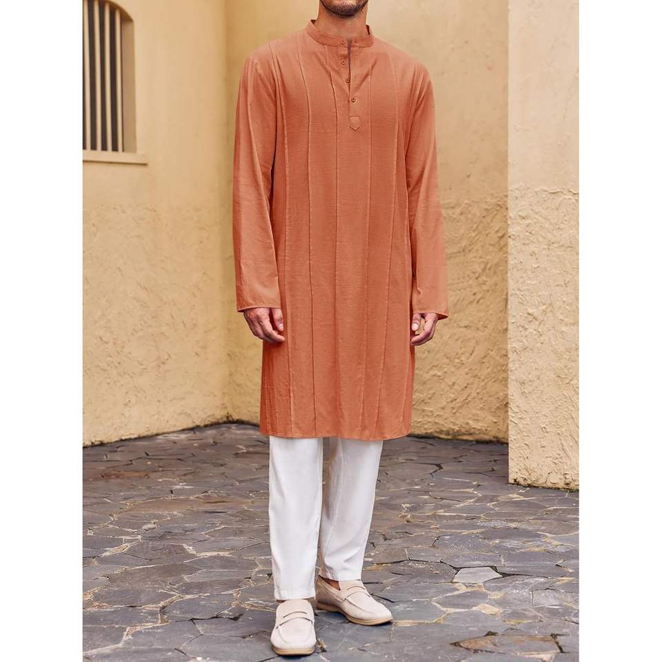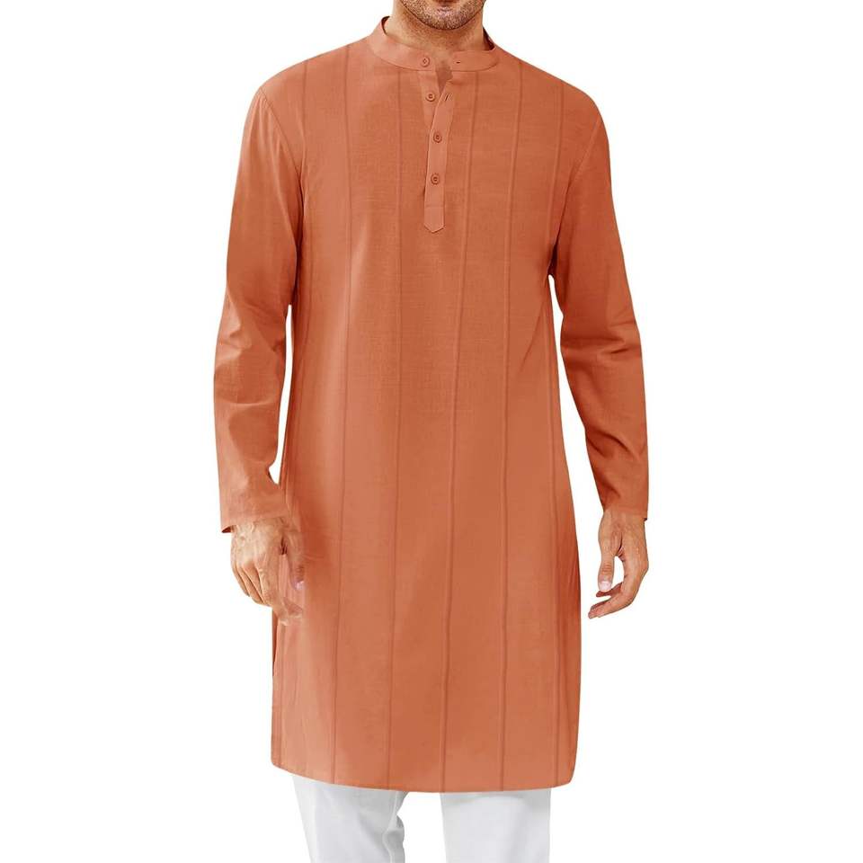 2025 hombres Kaftan Thobe botón abajo Henley camisa bata con mangas largas Casual algodón plisado vestido musulmán talla XS