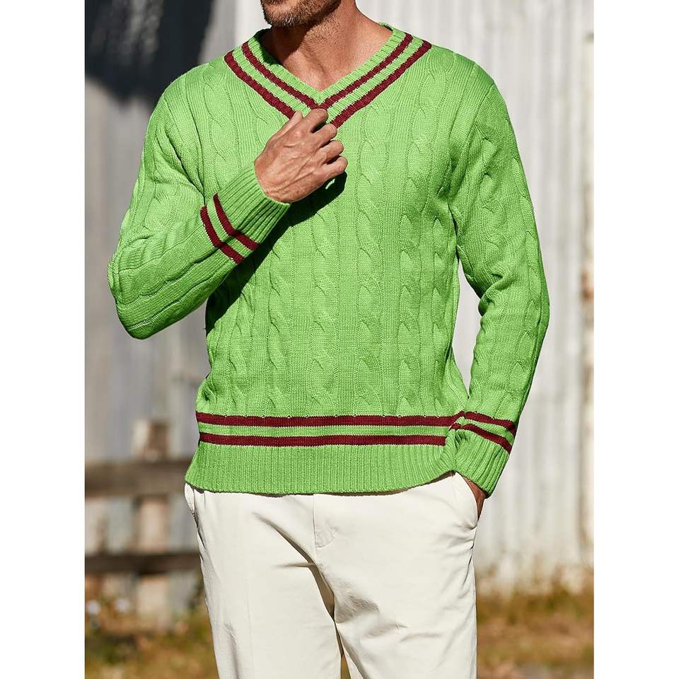 2025 suéter de punto con cuello en V para hombre, Jersey térmico de ajuste relajado grueso, diseño de giro a la moda para tenis para deportes al aire libre