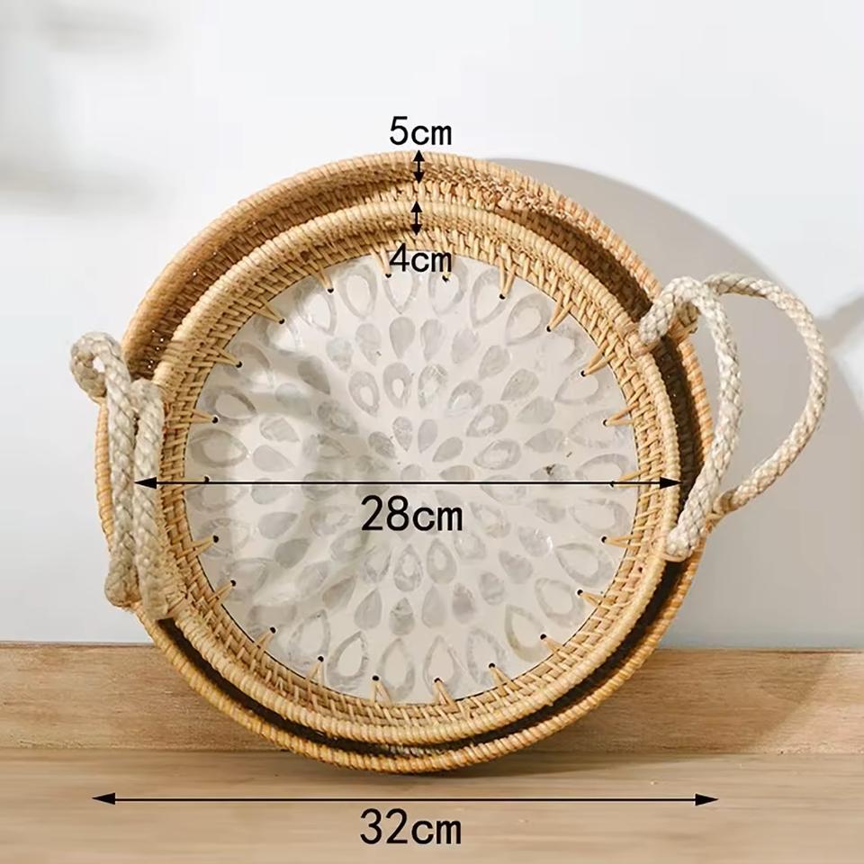 Bandeja de servicio con incrustaciones de ratán y nácar hecha a mano, bandeja decorativa de estilo costero bohemio para comedor, cocina y decoración del hogar