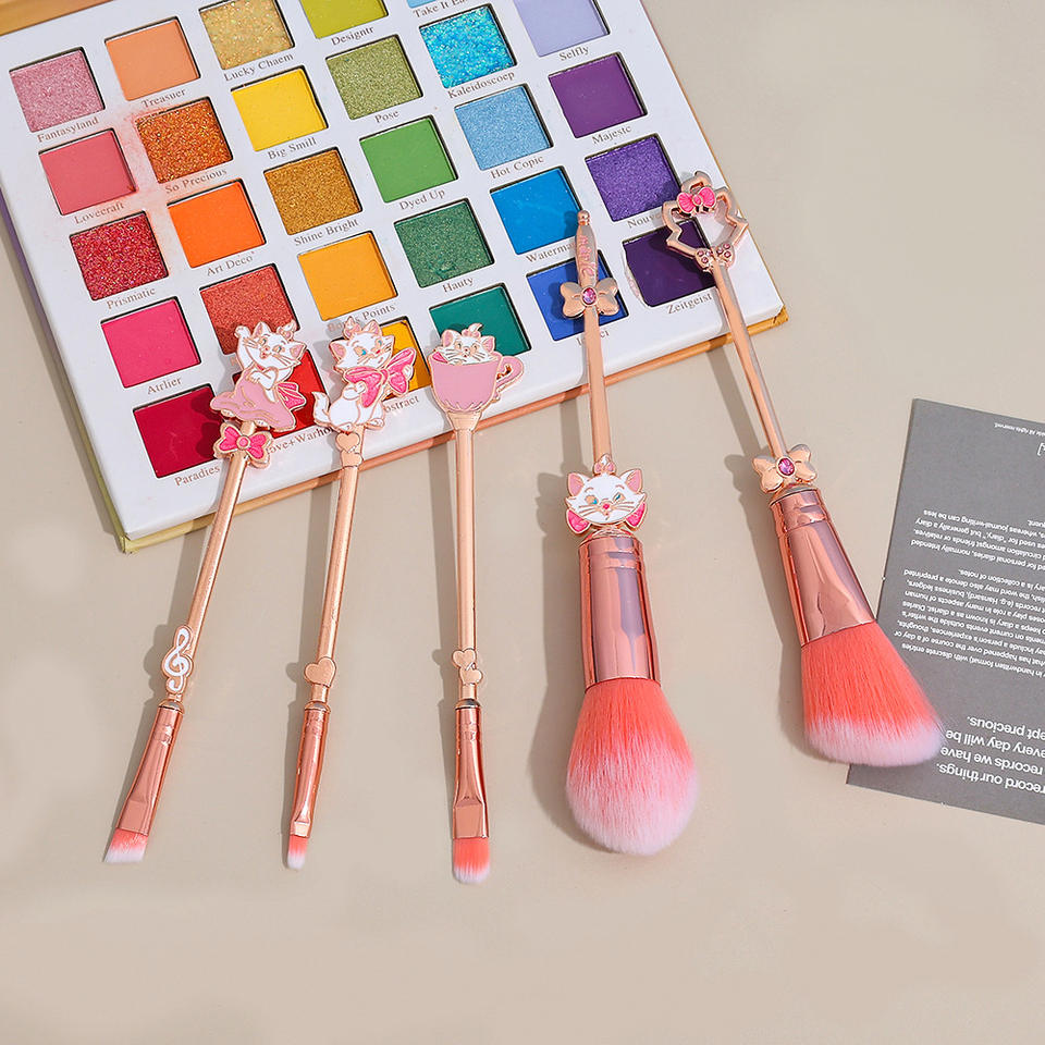 2025 nuevo 5 uds conjunto de brochas de maquillaje de gato Marie de dibujos animados de oro rosa para niñas exquisito conjunto de brochas de sombra de ojos de Metal brocha para polvo
