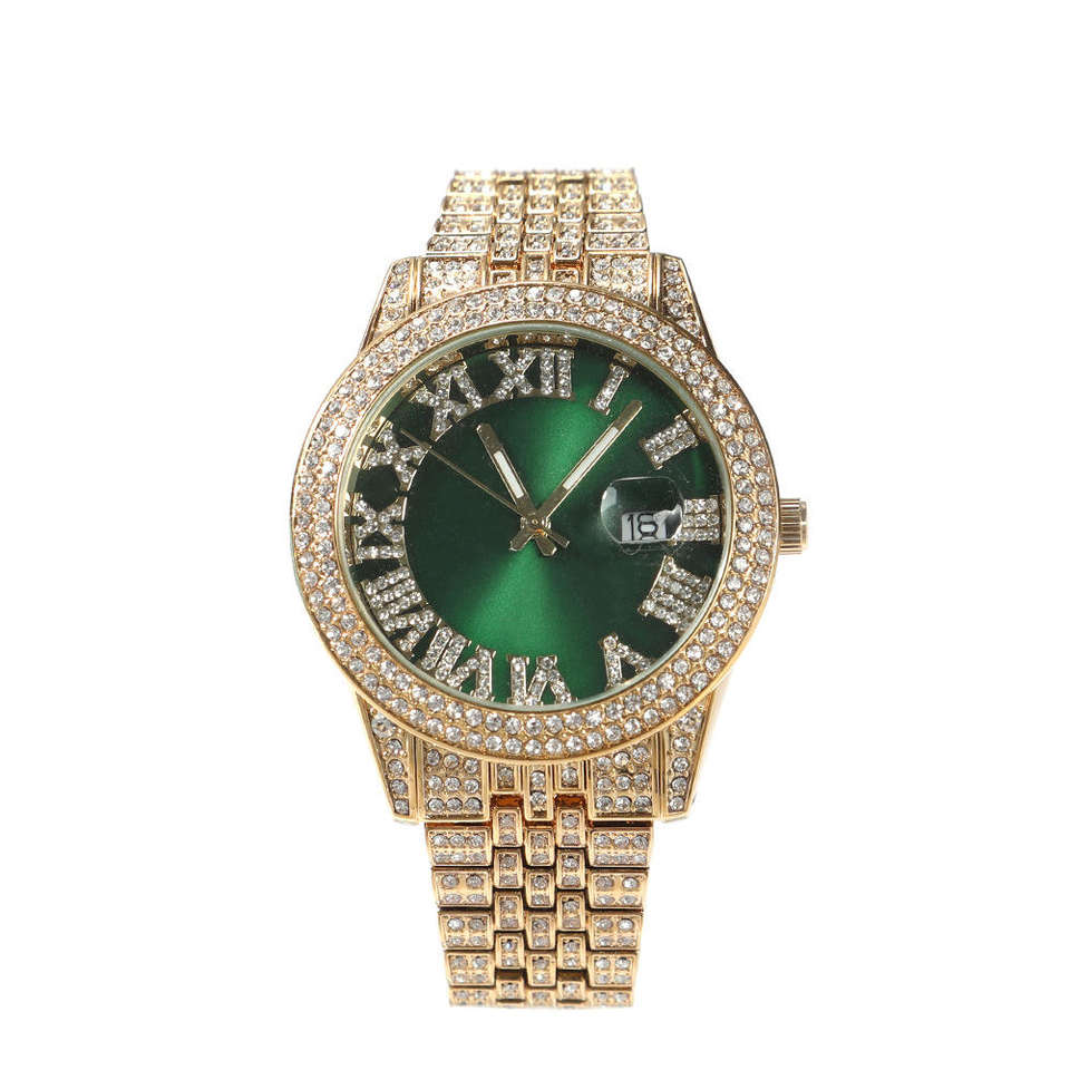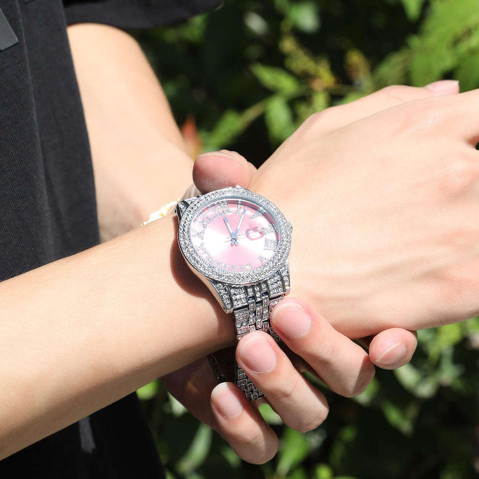 2025 nueva moda esfera grande diamante completo Hip Hop reloj de cuarzo para hombres mujeres correa de cuero impermeable 22mm ancho redondo rosa Dial