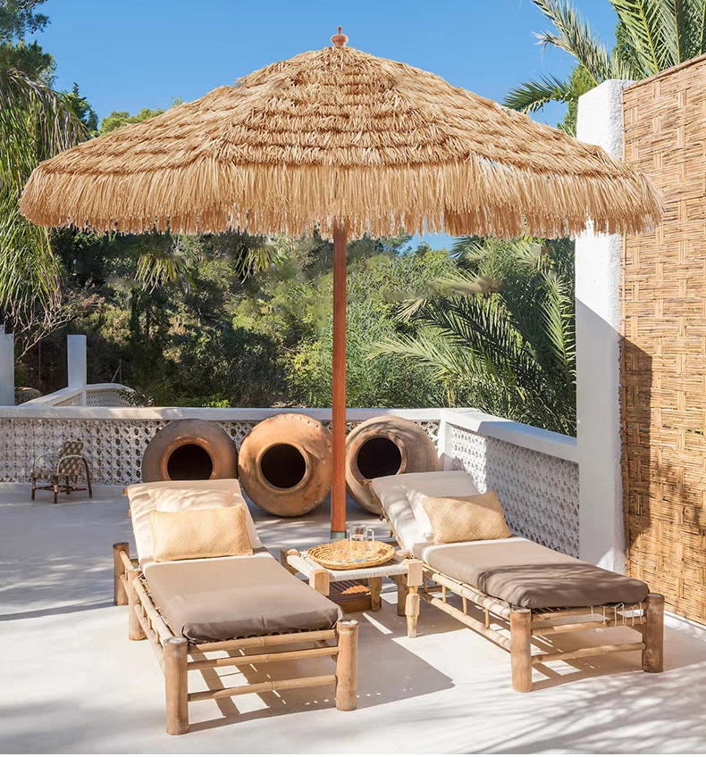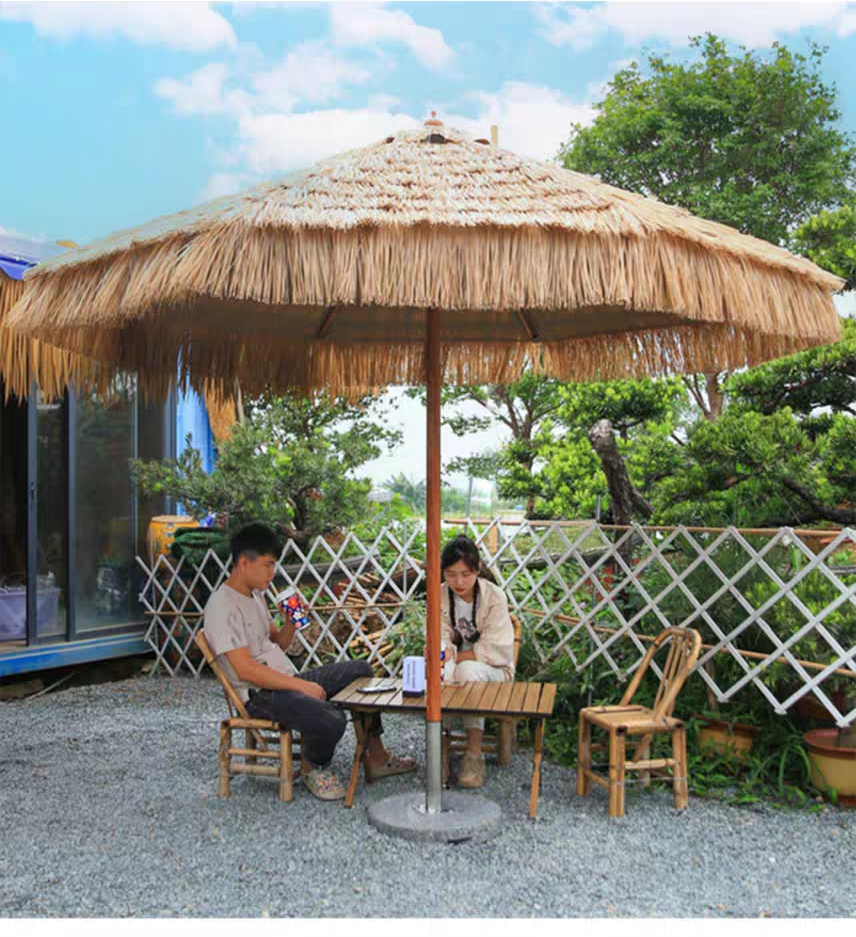 2025 Nueva fábrica práctica al por mayor paraguas de paja al aire libre barato impermeable y plegable para Resort de playa y área turística