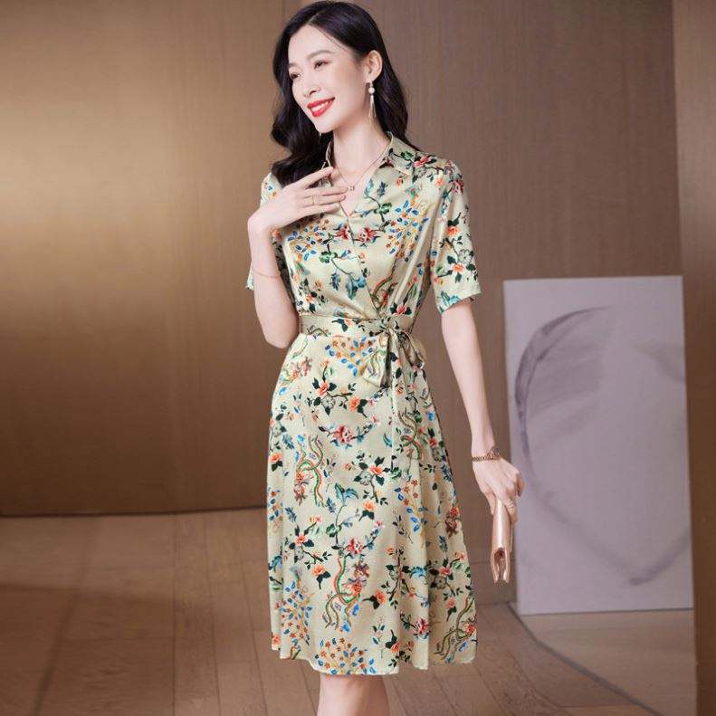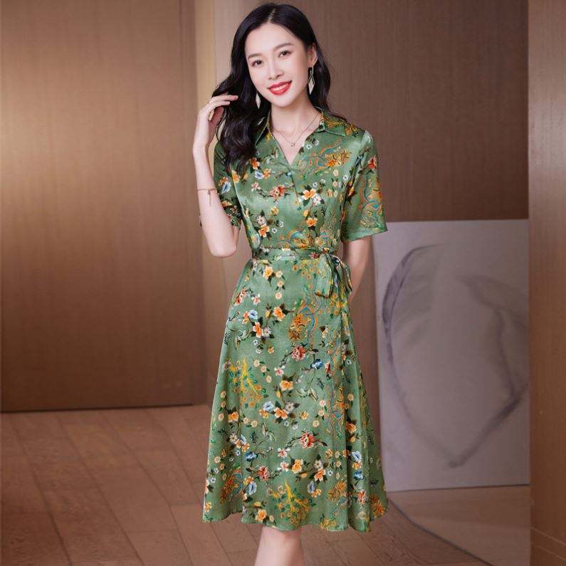 Vestido Midi con Estampado Floral Retro Nuevo de 2025, Falda de Satén hasta la Rodilla para Mujer, Cintura Natural, Estilo de Satén de Seda Tejida
