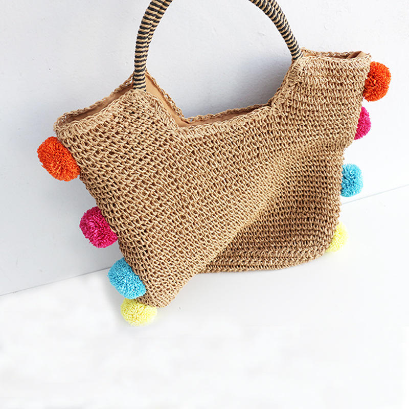 Bolso de Mano 2025, Nuevo, Color Sólido, Simple, con Bola de Peluche, Tejido a Crochet con Cuerda de Papel, Cierre de Cremallera, Moderno