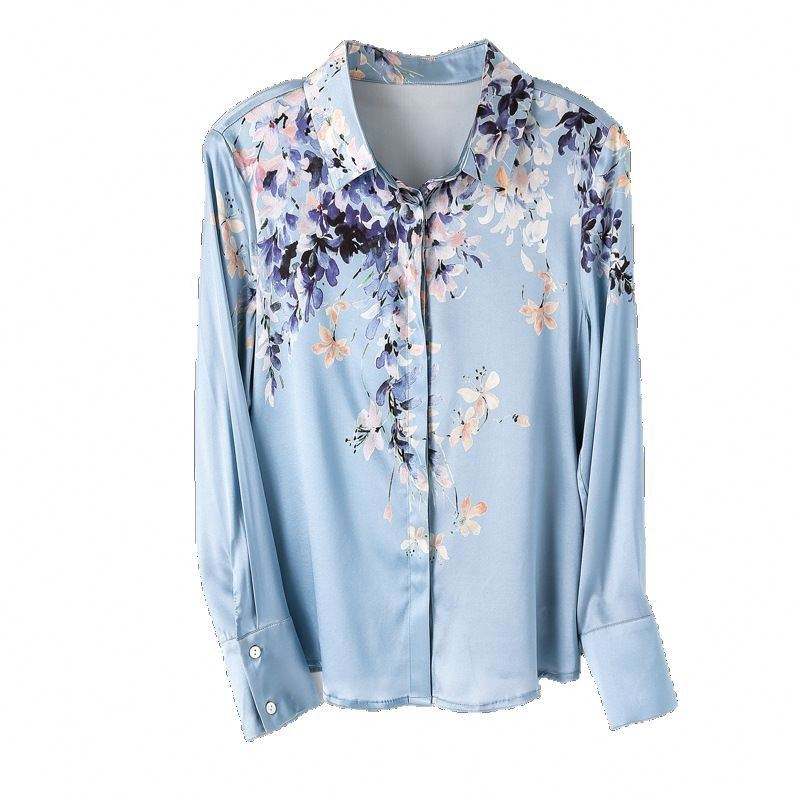 2025 Nueva colección de primavera otoño elegantes camisas de seda estampadas de manga larga para mujer patrón Floral estilo Casual decoración de botones