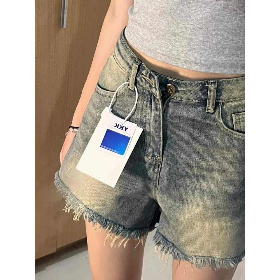 2025 nuevo diseño de primavera y verano, pantalones cortos de mezclilla con borde crudo de cintura alta para mujer, pantalones cortos holgados de pierna ancha, pantalones ajustados de cintura media