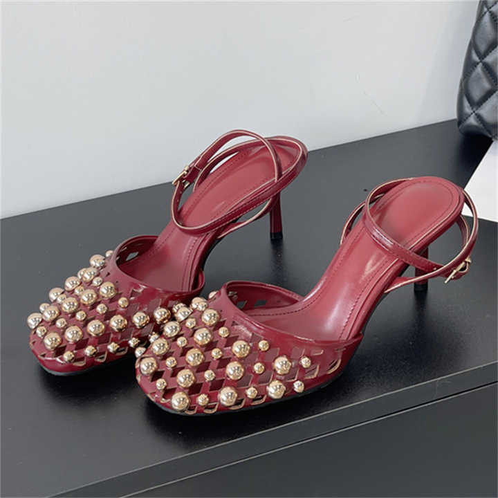 Nuevas Sandalias de Primavera 2025 con Punta Cuadrada y Remaches Metálicos, Zapatos Slingback de Tacón Alto Rojo Estilo Francés