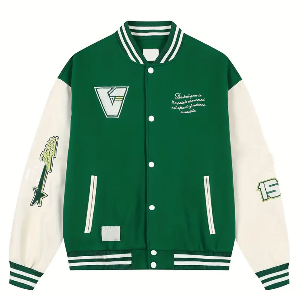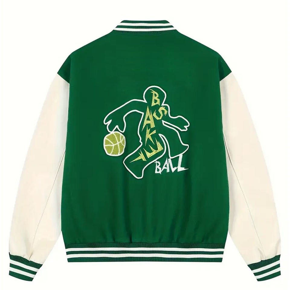 2025 Servicio OEM ODM Nuevo bloque de color vintage con parches bordados Chaquetas universitarias de manga de cuero de béisbol de ajuste suelto