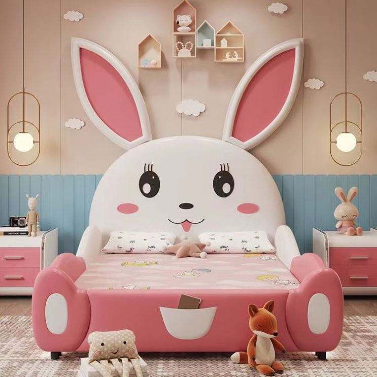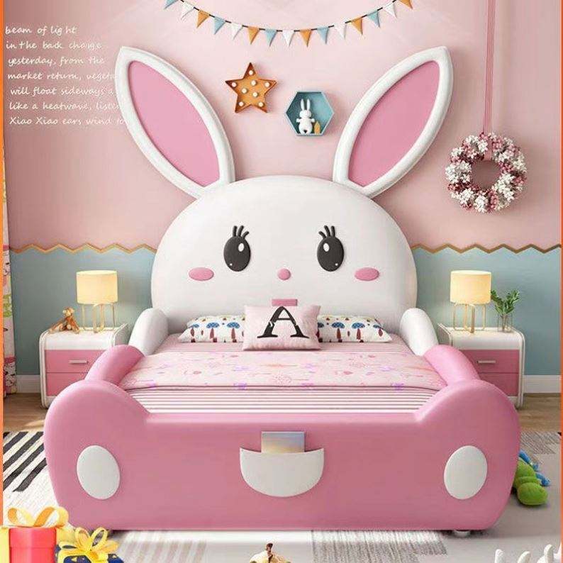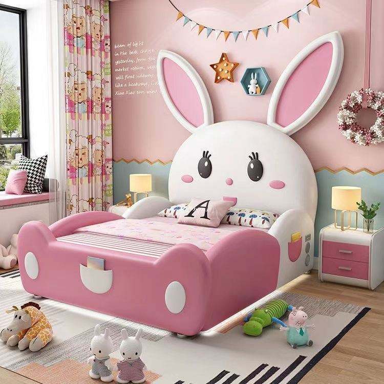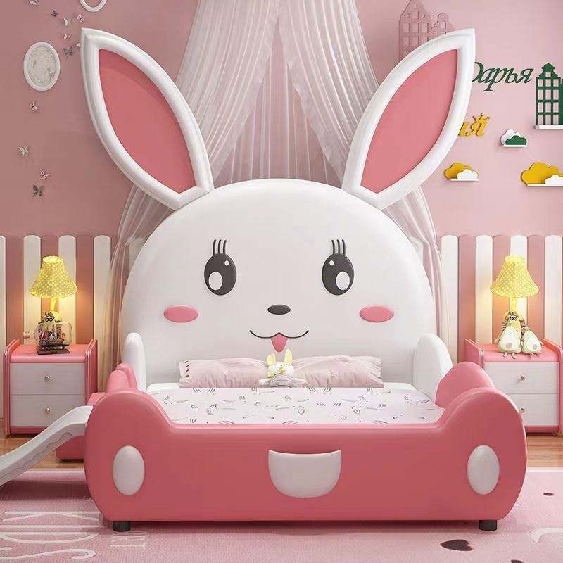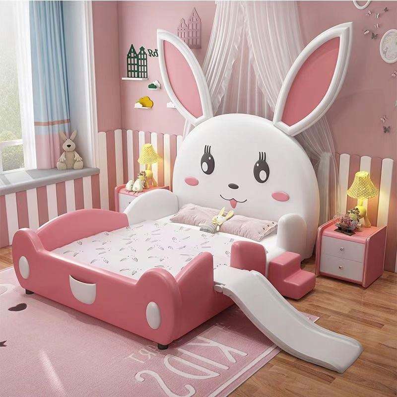 Cama Infantil con Tobogán Princesa Conejo 2025, Madera Maciza de Lujo, Tapicería de Algodón, Cómoda, Tamaño Completo, Linda, de Dibujos Animados, para Dormitorio de Niñas