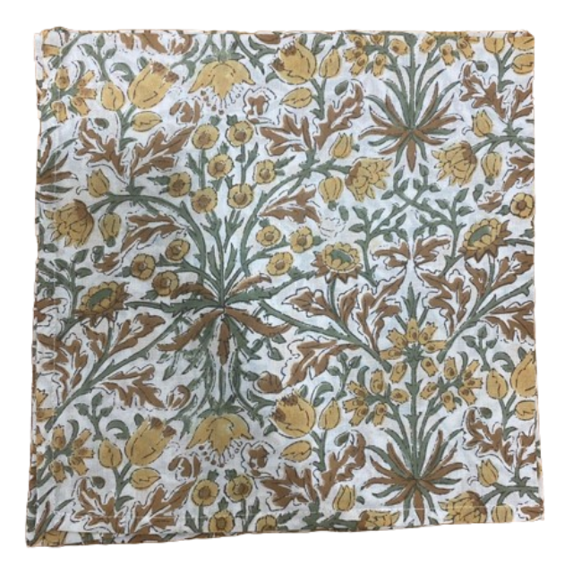 2025 Ridhi recién llegado moderno hecho a mano Floral impreso algodón servilletas cuadrado Goldenrod amarillo helecho verde cacahuete marrón indio