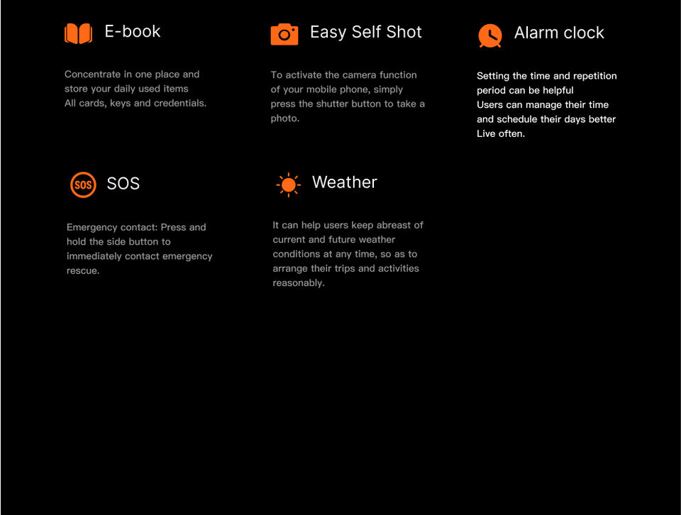 Calendario, Reloj despertador, Cuenta atrás, Rastreador de sueño, seguimiento de forma, Recordatorio de llamada, Respuesta telefónica, Mensaje emergente, Recordatorio de mensajes, Marcar llamada, Monitor de ritmo cardíaco, Medida de humedad, Control de gestos, Navegacion GPS, Notificaciones de Medios sociales, Rastreador de calorías, Llamada de voz, Monitor de respiración, Rastreador de distancia, Recordatorio sedentario, Botón SOS, Videollamada, Asistente de voz AI, CalculadorasFunción