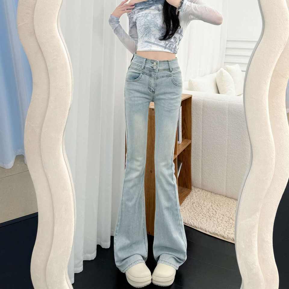 2025 primavera otoño nueva menta Mambo cintura alta Slim Fit Horseshoe Jeans para mujeres XL azul claro arco acampanado pantalones transpirables