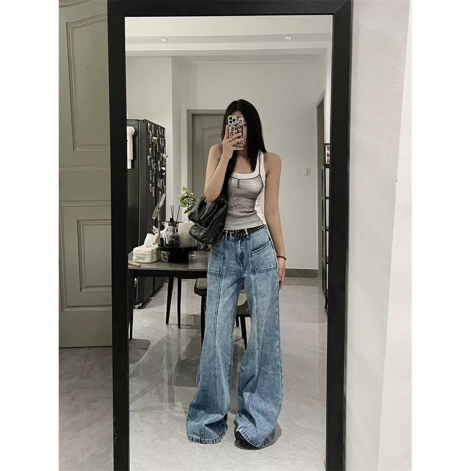 Pantalones vaqueros rasgados para mujer, primavera otoño 2025, rectos, lavados, finos, sueltos, de pierna ancha, pantalones acampanados, transpirables, informales, con logotipo en la cintura