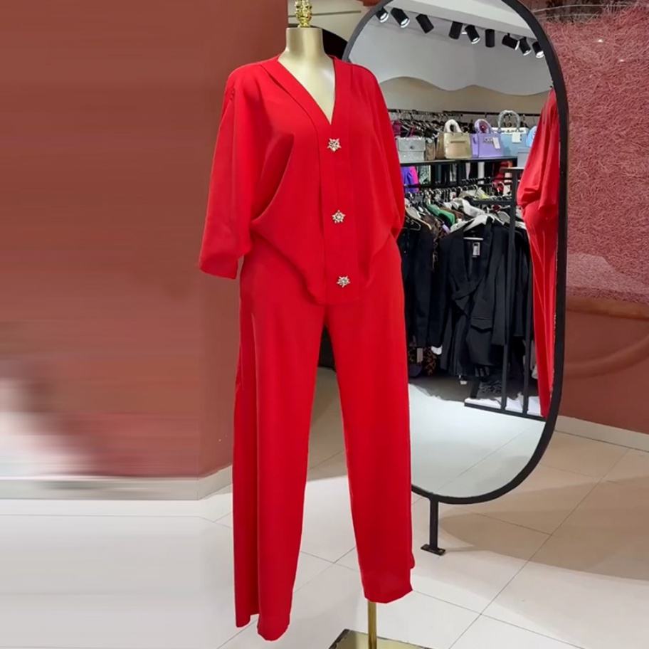 Colección Primavera 2025: Camisa de Manga Siete, Cuello en V, Cintura Alta, Pierna Recta, Holgada, Casual, con Patrón Sólido para Mujer, Estilo Europeo Americano