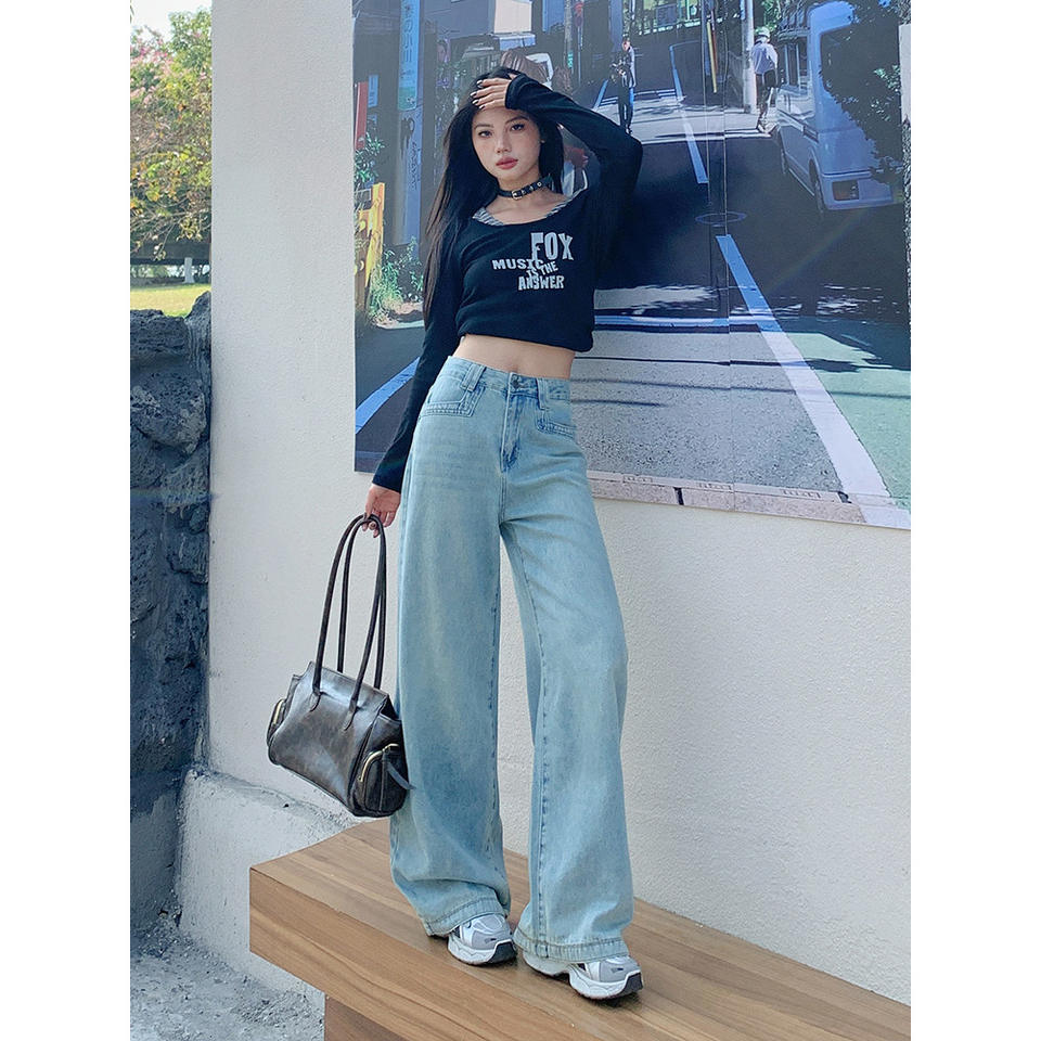Colección primavera 2025 Lyocell azul claro para Tencel Jeans para mujer suelta pierna ancha drapeado tamaño pequeño pantalones de nueve puntos