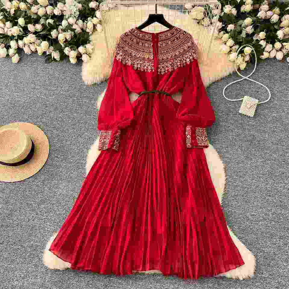 Vestido Midi Plisado Tipo Túnica Romana con Corte en A, Tejido Sostenible y Transpirable, con Encaje y Lentejuelas, para Mujer, Primavera 2025
