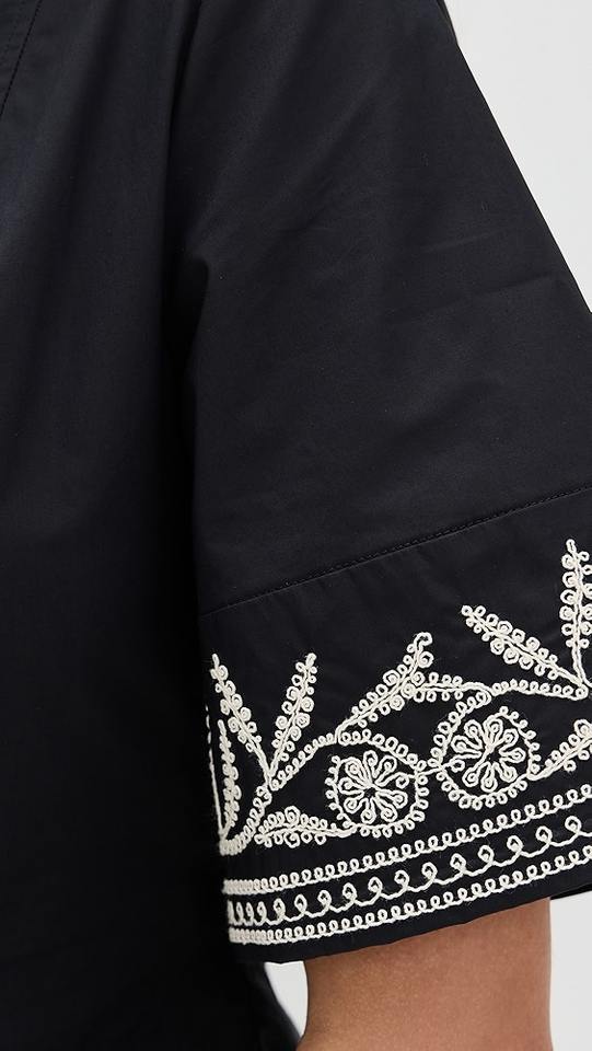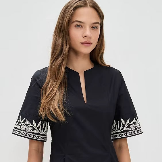 Vestido Casual Negro Largo con Bordado Tejido, Primavera 2025, Mangas Cortas con Vuelo, Cuello en V, Lavable