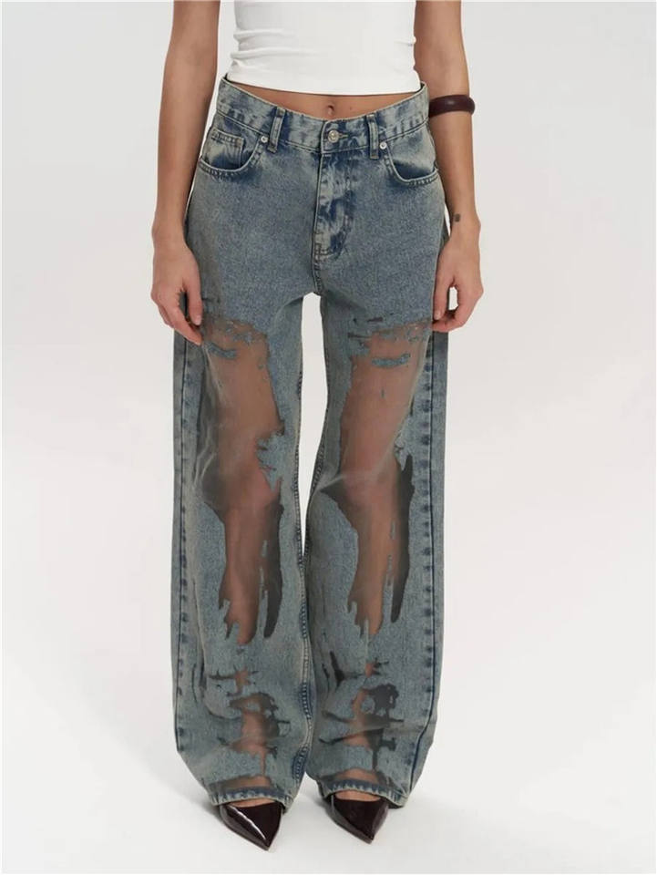 2025 primavera Y2k Pantalones rectos Retro textura calada gradiente Jeans pantalones sueltos de pierna ancha