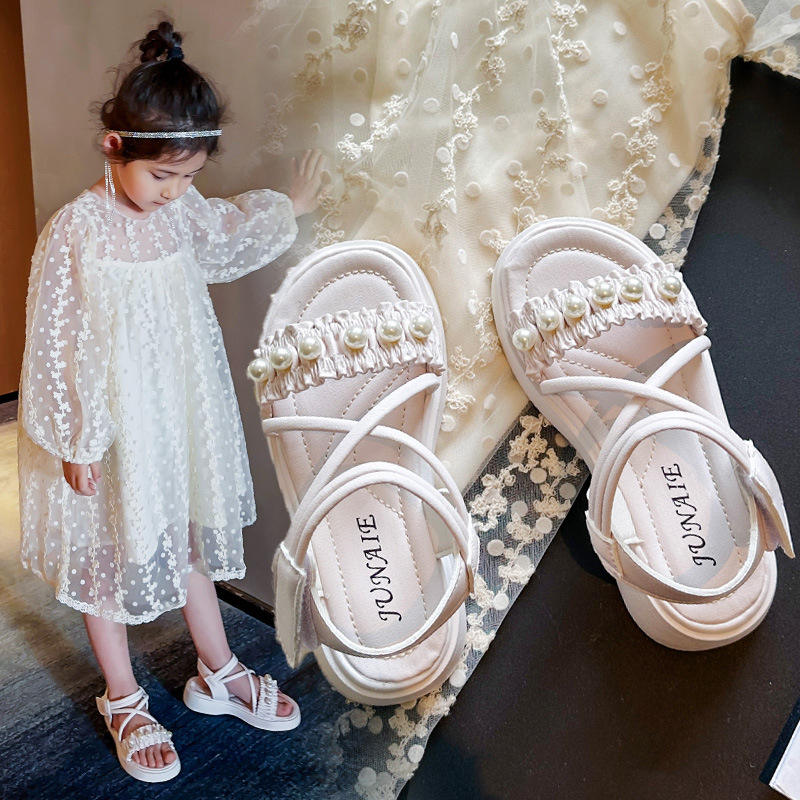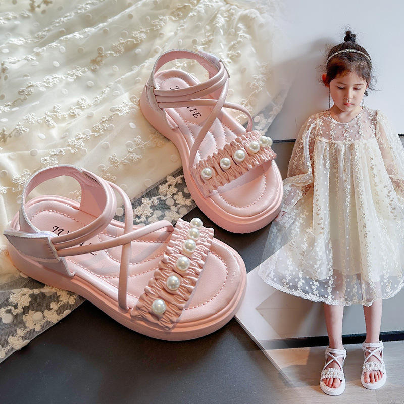 Sandalias de perlas de moda para niñas de verano 2025, zapatos de playa con punta abierta y fondo suave estilo princesa para niños