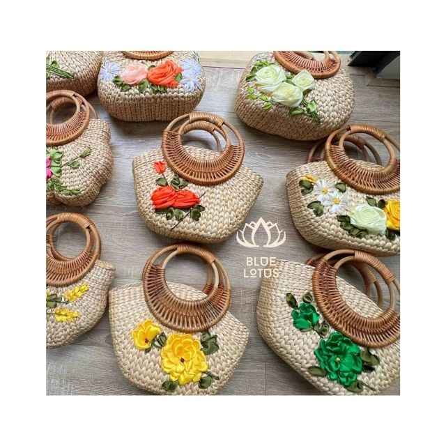 ARTÍCULO SUPERIOR 2025 Bolso de Mano Hecho a Mano con Asa de Jacinto de Agua de Vietnam, Diseño de Loto Azul, Venta al por Mayor