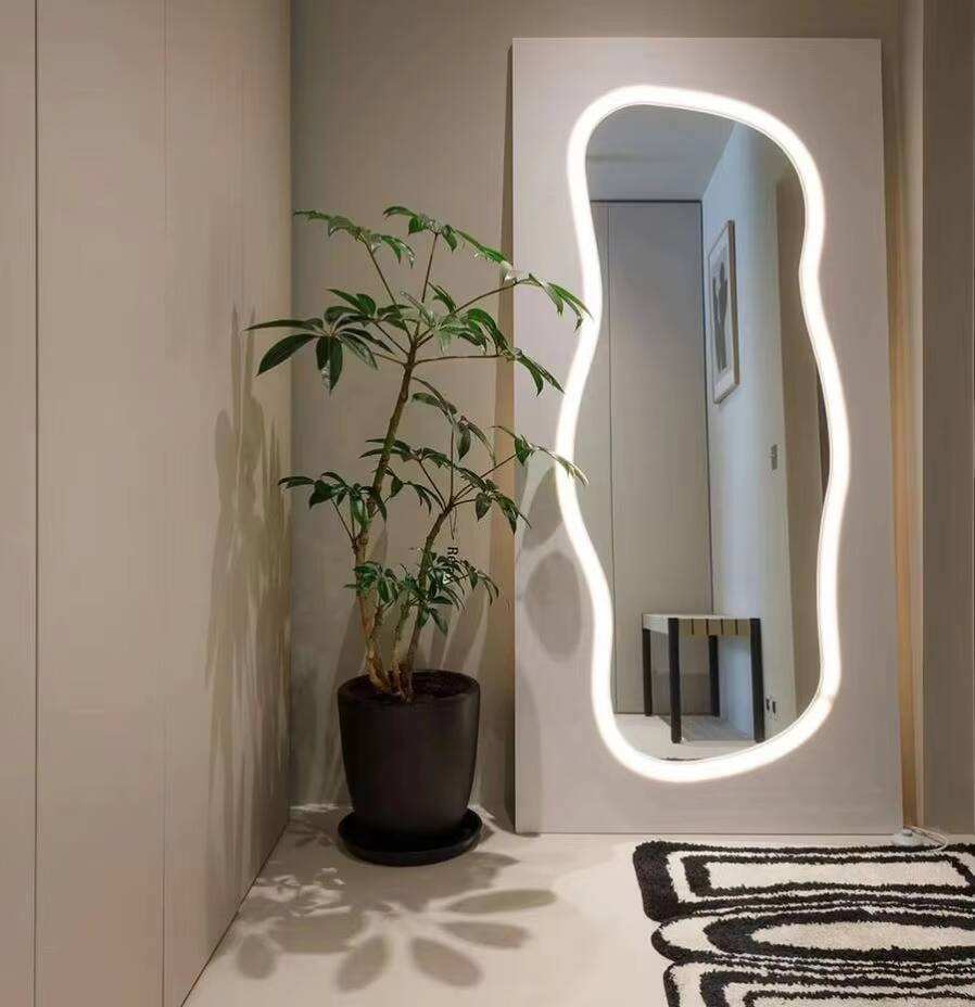 Espejo de Pie de Cuerpo Entero Contemporáneo de Tendencia 2025, Duradero, de Vidrio Templado de 4 mm con Marco de Madera, Tamaño Personalizado, Retroiluminación Ondulada para el Hogar