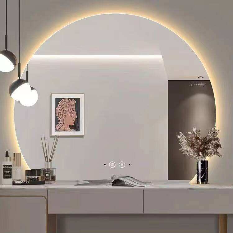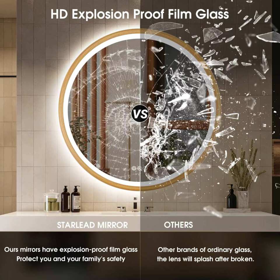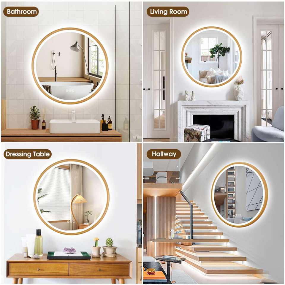 Espejo de Baño Moderno con Marco de Madera, Montado en la Pared, con Iluminación LED de 3 Tonos Regulable, Personalizable, Tendencia 2025, para Sala de Estar