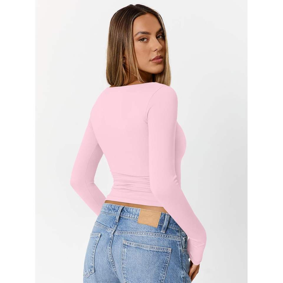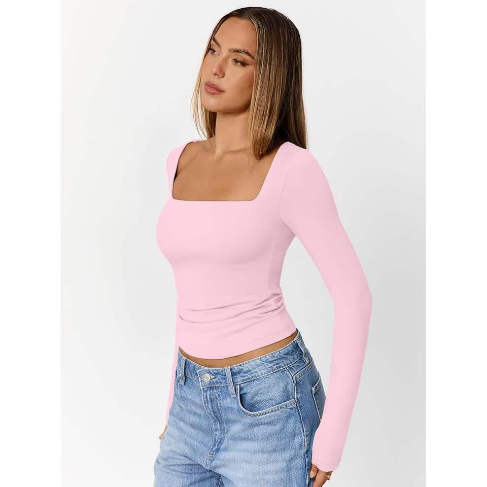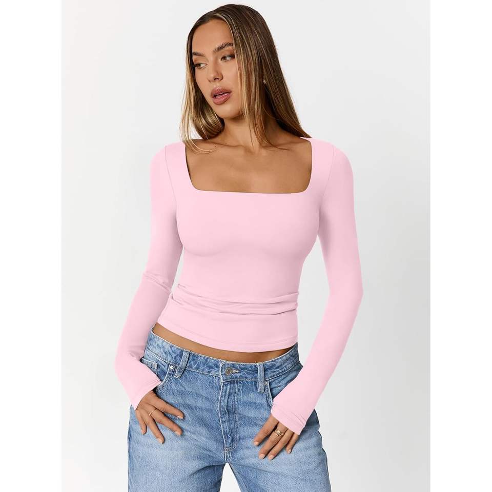2025 Trendy Queen Womens Crop Slim Fit Camisetas básicas Manga larga Doble forro Cuello cuadrado Capa informal Método de tejido de punto