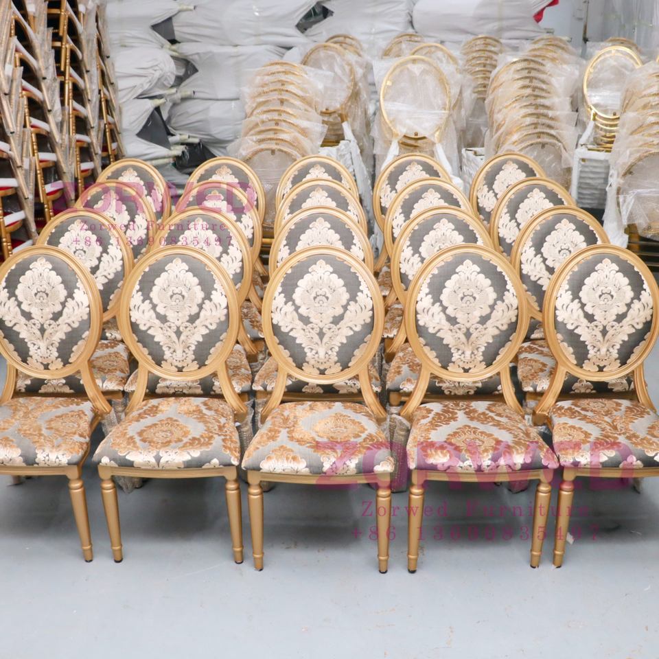 2025, venta al por mayor, nuevo diseño de lujo, Metal apilable, parte trasera ovalada, aluminio, Hotel, salón de bodas, mesas y sillas para banquetes para eventos