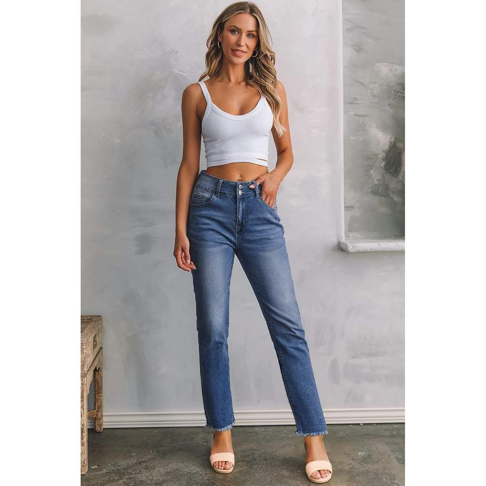 2025 pantalones de mezclilla de pierna recta con dobladillo crudo elástico de cintura alta para mujer, pantalones vaqueros transpirables de lápiz y novio con bolsillos