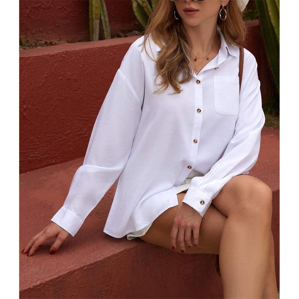 2025 camisas de manga larga con botones para mujer, pantalones de pierna ancha, decoración bordada con cuello levantado, tallas XS XL disponibles para oficina