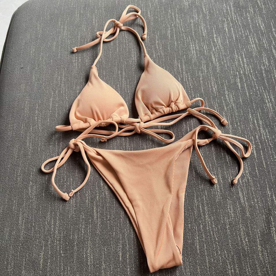 Conjunto de Bikini Sexy para Mujer 2025, Traje de Baño con Espalda Descubierta, Top Triangular con Tirantes, Braguita de Tanga, Estilo Liso de Talle Bajo
