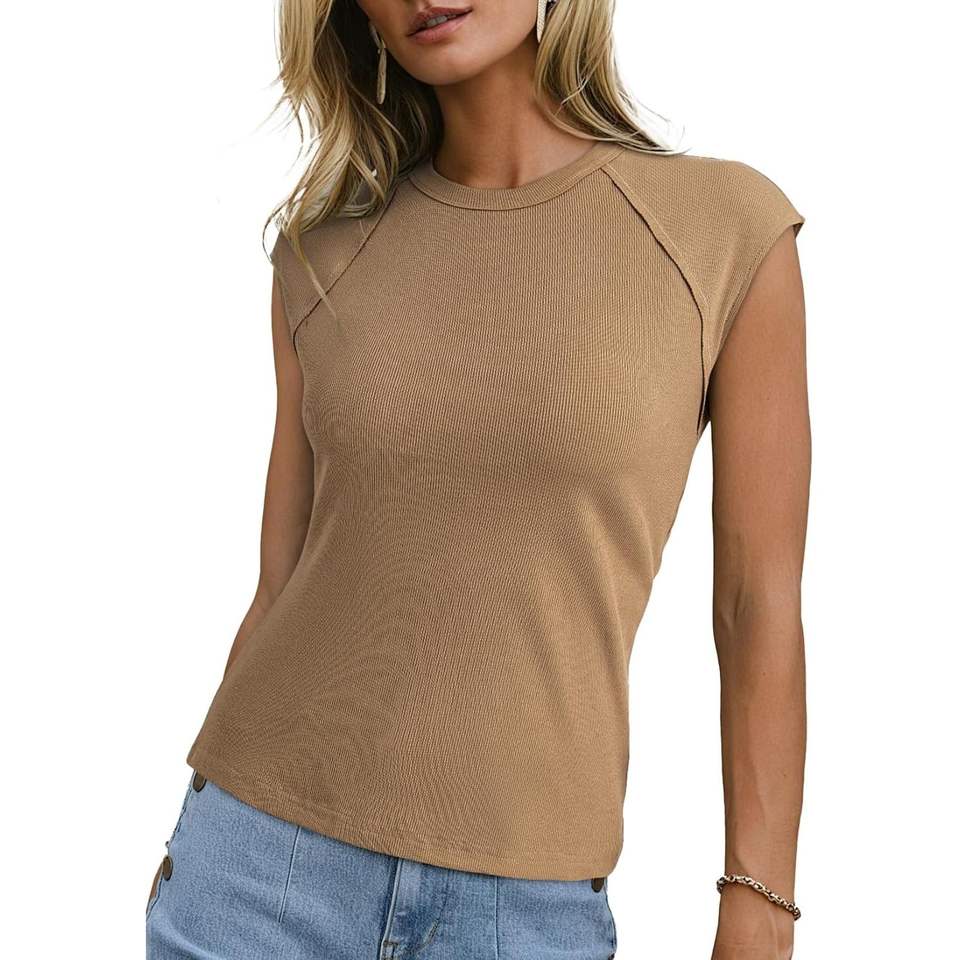 2025 blusas de verano ajustadas para mujer, camisetas informales con cuello redondo y manga gorra con dobladillo crudo acanalado, blusas básicas en talla XL