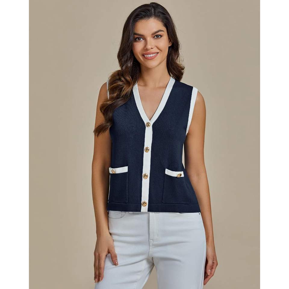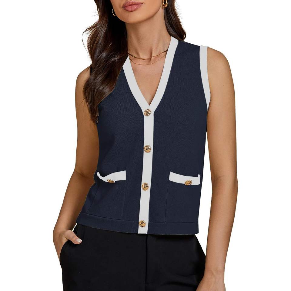 2025 mujeres de moda Colorblock botón abajo elegante Casual sin mangas verano suéter Chaleco con bolsillos para la temporada de primavera