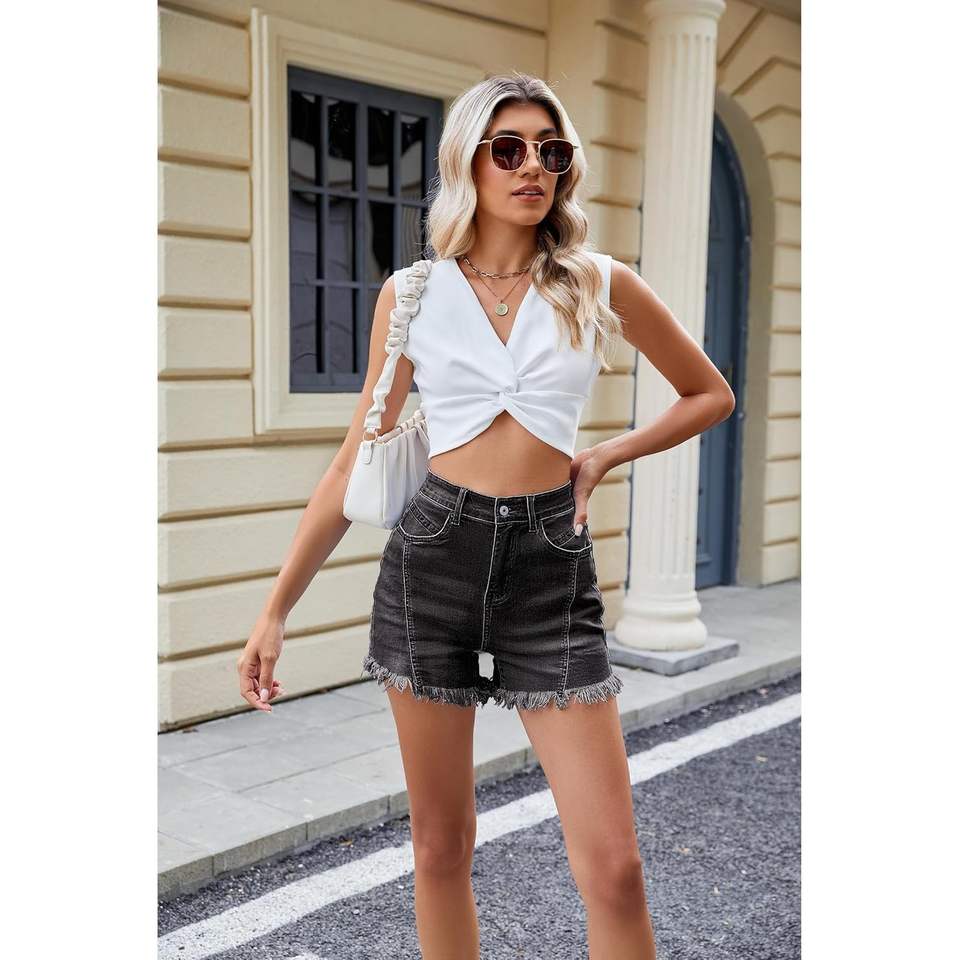 2025 pantalones cortos de mezclilla de cintura alta de moda para mujer cosidos en la parte delantera elásticos ajustados con dobladillo deshilachado cortado para verano informal