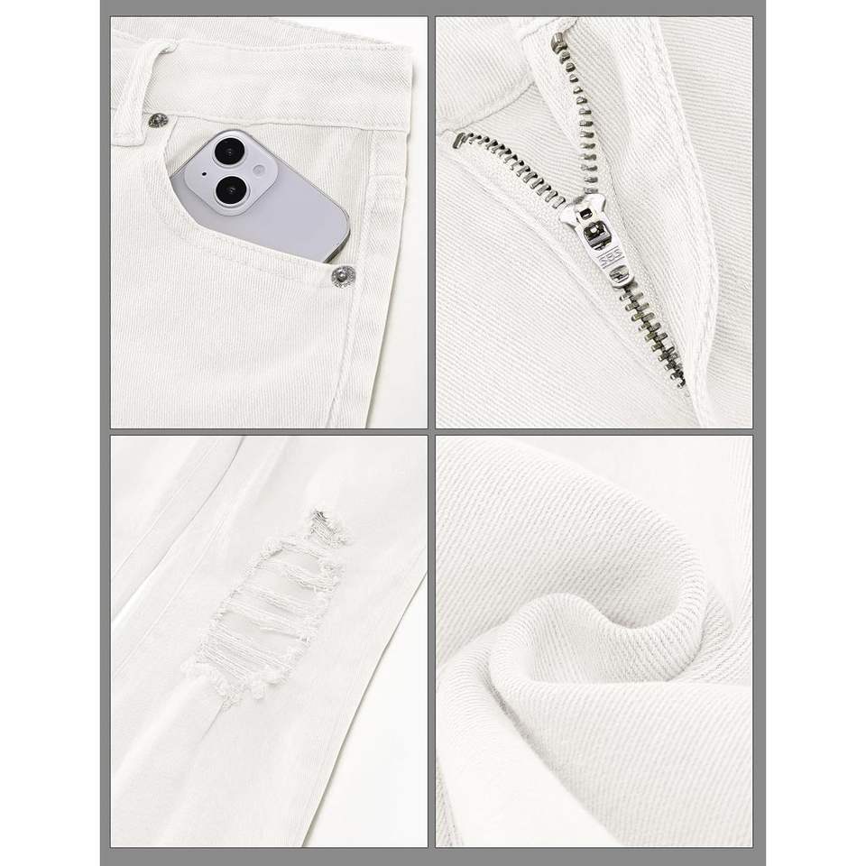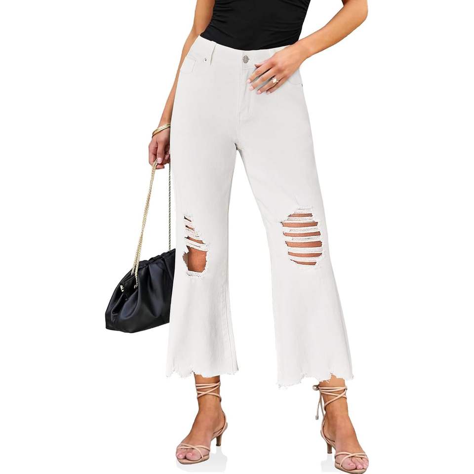 2025, pantalones vaqueros recortados de cintura alta a la moda para mujer, pantalones vaqueros acampanados elásticos de pierna ancha con dobladillo crudo desgastado, diseño transpirable