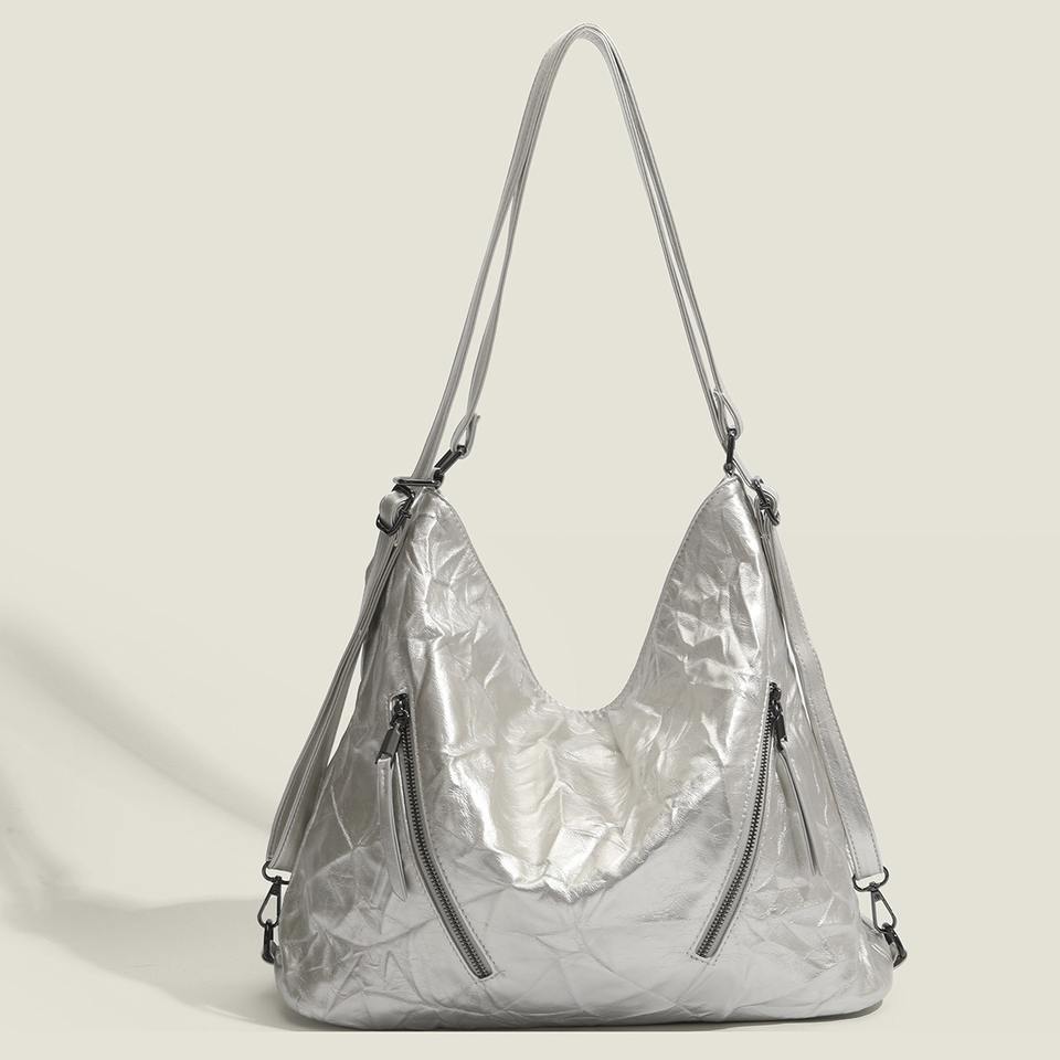 2025 nuevo bolso de hombro de cuero plisado plateado de gran capacidad práctico estilo vanguardista