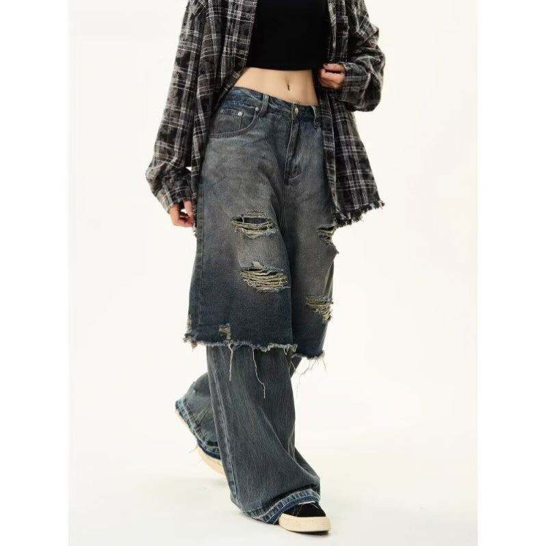 Pantalones Vaqueros Retro Americanos 2026 de Doble Perforación con Parches Lavados para Hombre - Pantalones Casuales de Pierna Recta con Agujeros Estilo High Street