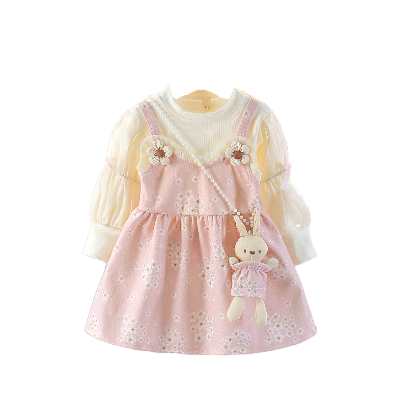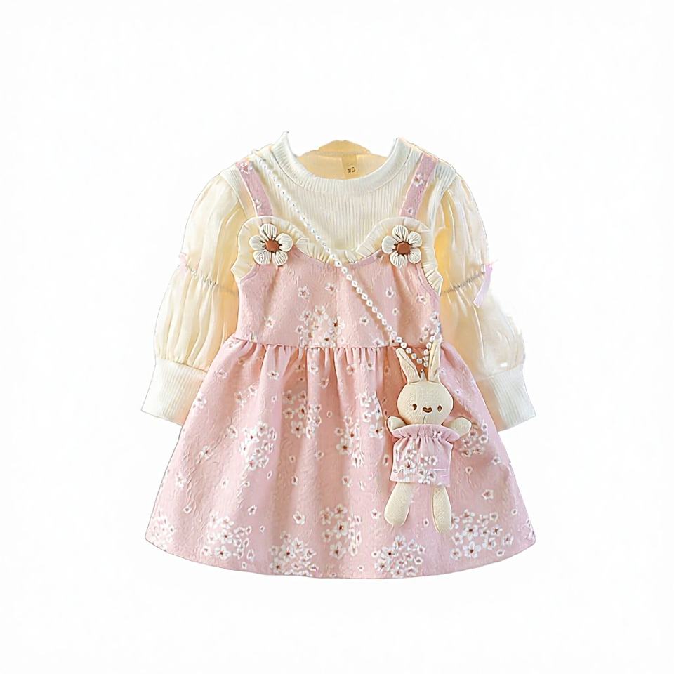 Vestido Infantil de Otoño-Primavera 2026 para Niñas, Estilo Dulce y Moderno, Ecológico, con Estampado Floral, Cuello Redondo y Decoración de Conejo