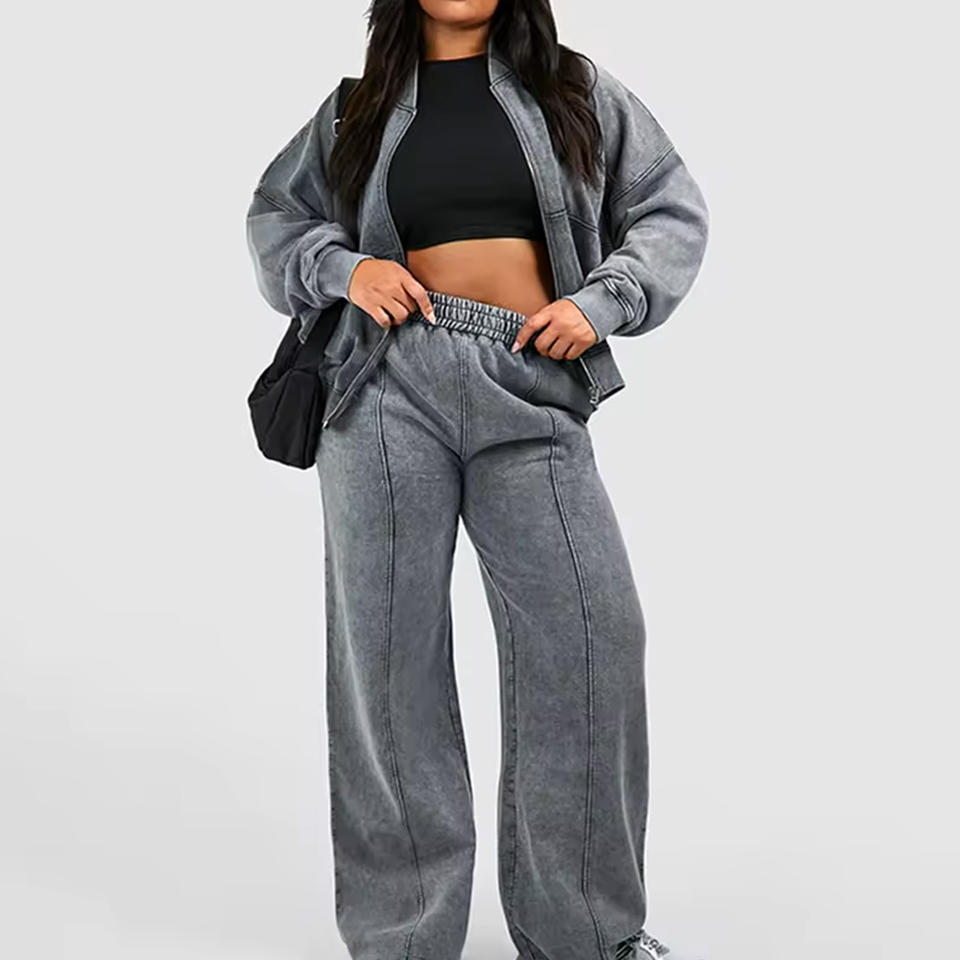 Conjunto de Chándal Personalizado con Lavado Ácido y Cremallera Completa, Pantalones Acampanados – 100% Algodón, Forro Polar Pesado de 400 GSM para Mujer