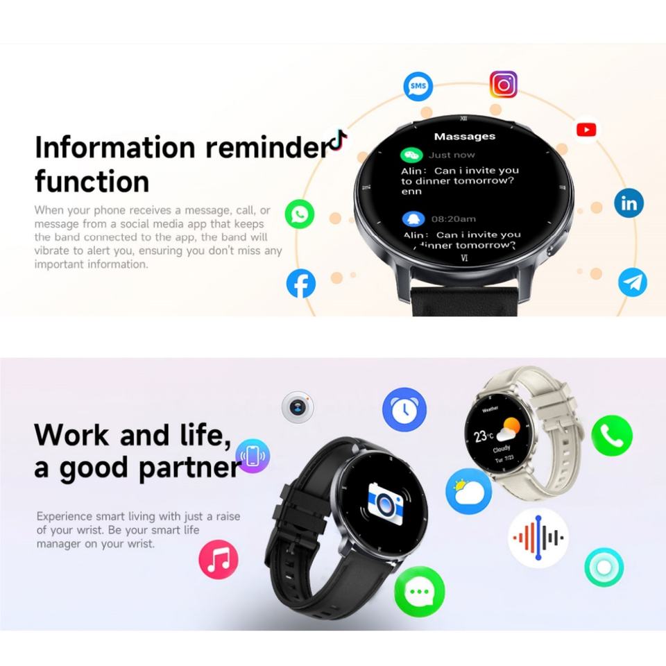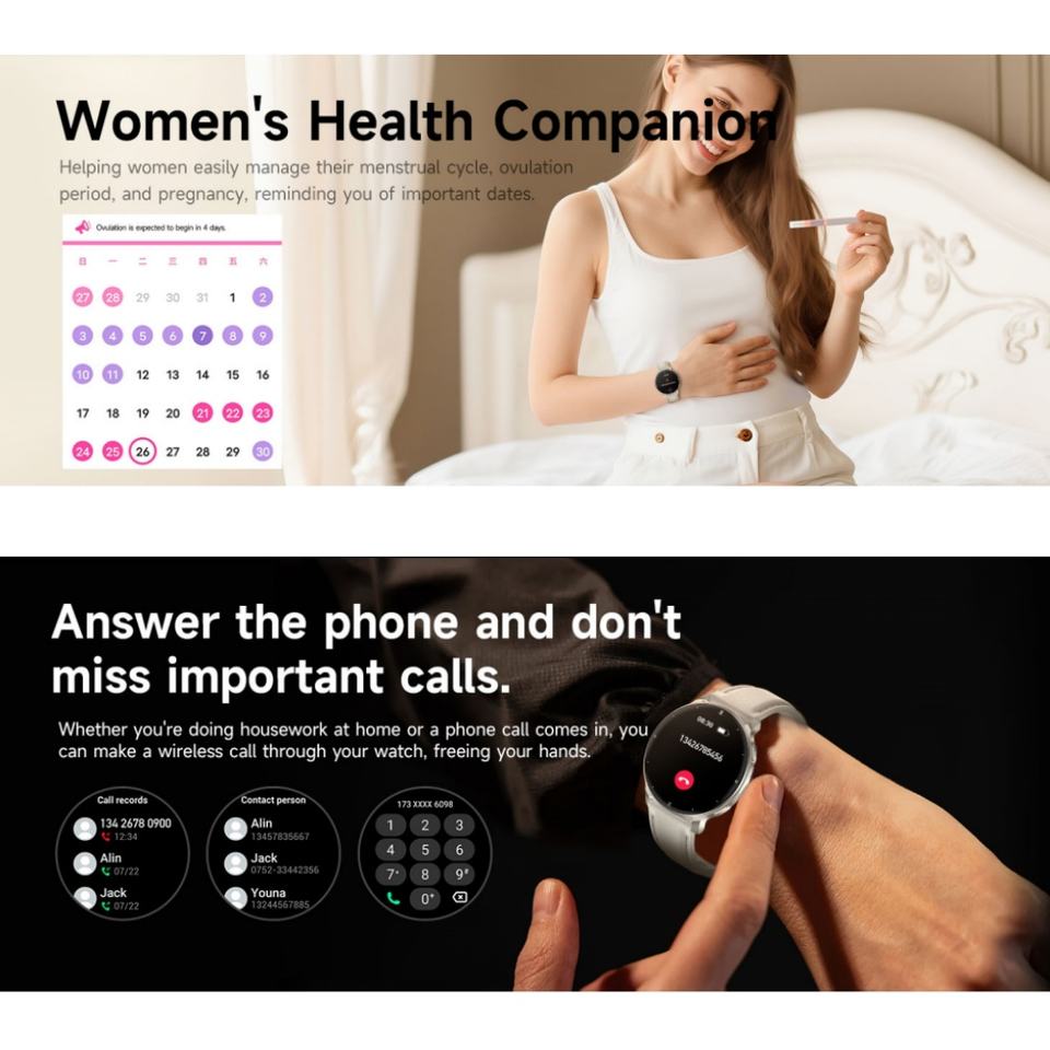 Seguimiento de la actividad, Reloj despertador, Recordatorio de llamada, Rastreador de calorías, Marcar llamada, Rastreador de distancia, Correo electrónico, seguimiento de forma, Monitor de ritmo cardíaco, Recordatorio de mensajes, Podómetro, Podómetro, Posicionamiento, Mensaje emergente, Control remoto, Rastreador de sueño, Llamada de voz, Grabación de Audio, Monitor de respiración, Reproductor DE MÚSICA, Recordatorio sedentario, Notificaciones de Medios sociales, Hora mundial, Asistente de voz AI, Respuesta telefónica, Cronógrafo, Gestión menstrual, Rastreador multideporteFunción