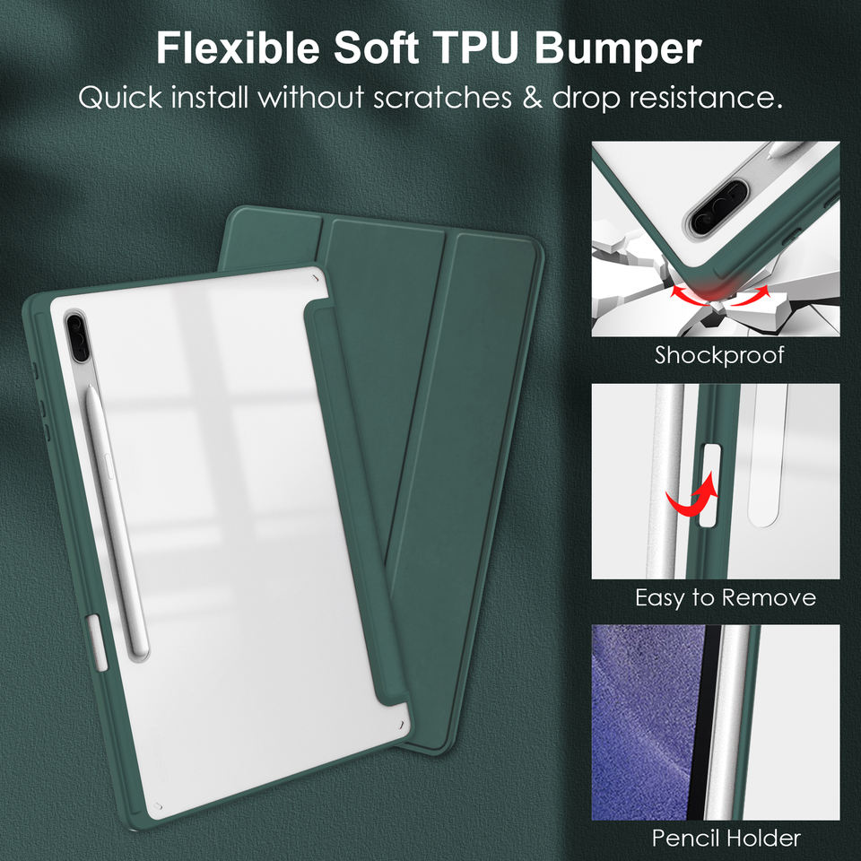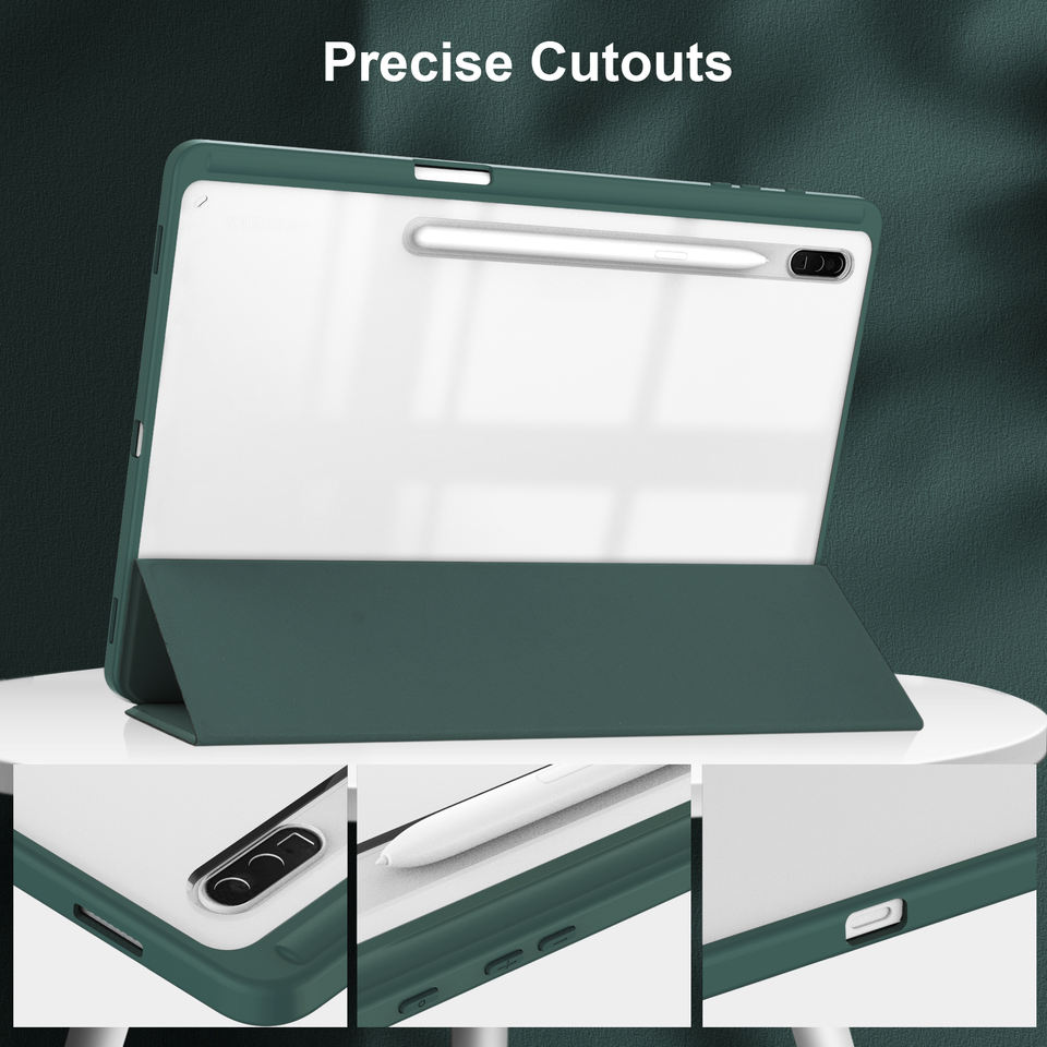 Funda trasera Crystal-View JUNCHI 2026 para Samsung Tab 8.7-14.6" con agarre suave, sensor frontal, función de activación/desactivación, ranura rápida para lápiz y opción de protector de lente
