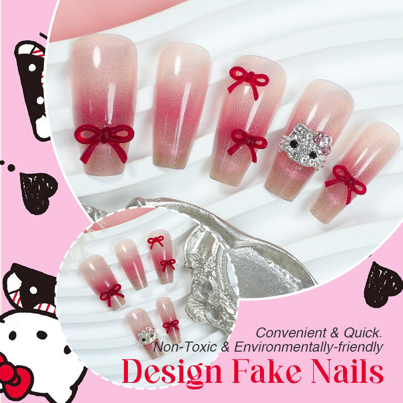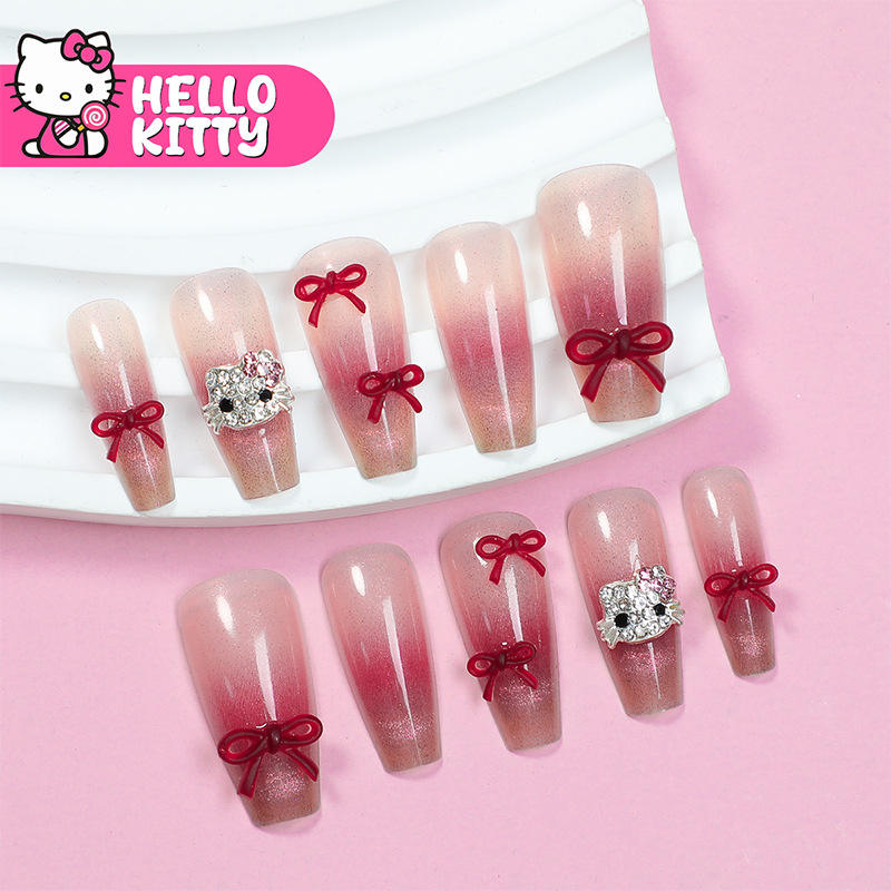 Últimos Modelos 2026, Uñas Postizas Hechas a Mano de Hello Kitty, Uñas Postizas Dulces y Largas con Degradado de Cereza, Venta al por Mayor