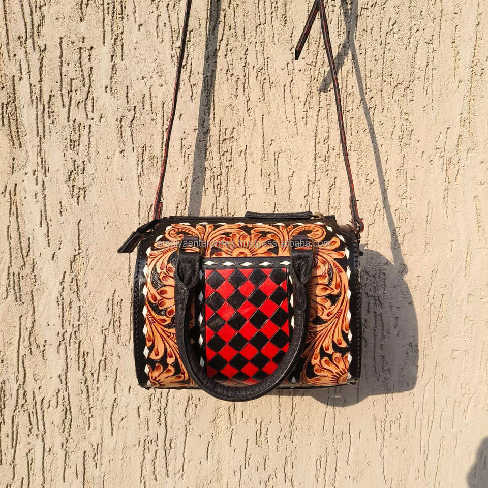 Product name:Tooled Hair-On Cowhide Checkered Pattern Duffel Bag